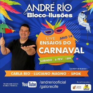 O tradicional “Ensaios do Carnaval”, realizado todos os anos pelo cantor recifense André Rio, realizará sua 14ª edição, desta vez em formato digital. A prévia do famoso carnaval do estado levará a folia para dentro da casa dos internautas através de uma live que será transmitida no canal do YouTube do cantor, o André Rio Oficial, e pelo canal do Galo da Madrugada, o Galo Recife, e contará com a participação de convidados como Carla Rio, Luciano Magno e Spok, para completar a festa carnavalesca com muito frevo de bloco e canções de rua. O evento será realizado diretamente da sede do Galo e respeitará todos os protocolos de saúde como o uso de máscaras, distanciamento social e álcool em gel. Juntamente com a colaboração especial do Bloco das Ilusões, o público poderá se divertir com a transmissão neste sábado, 6 de fevereiro, a partir das 18h.