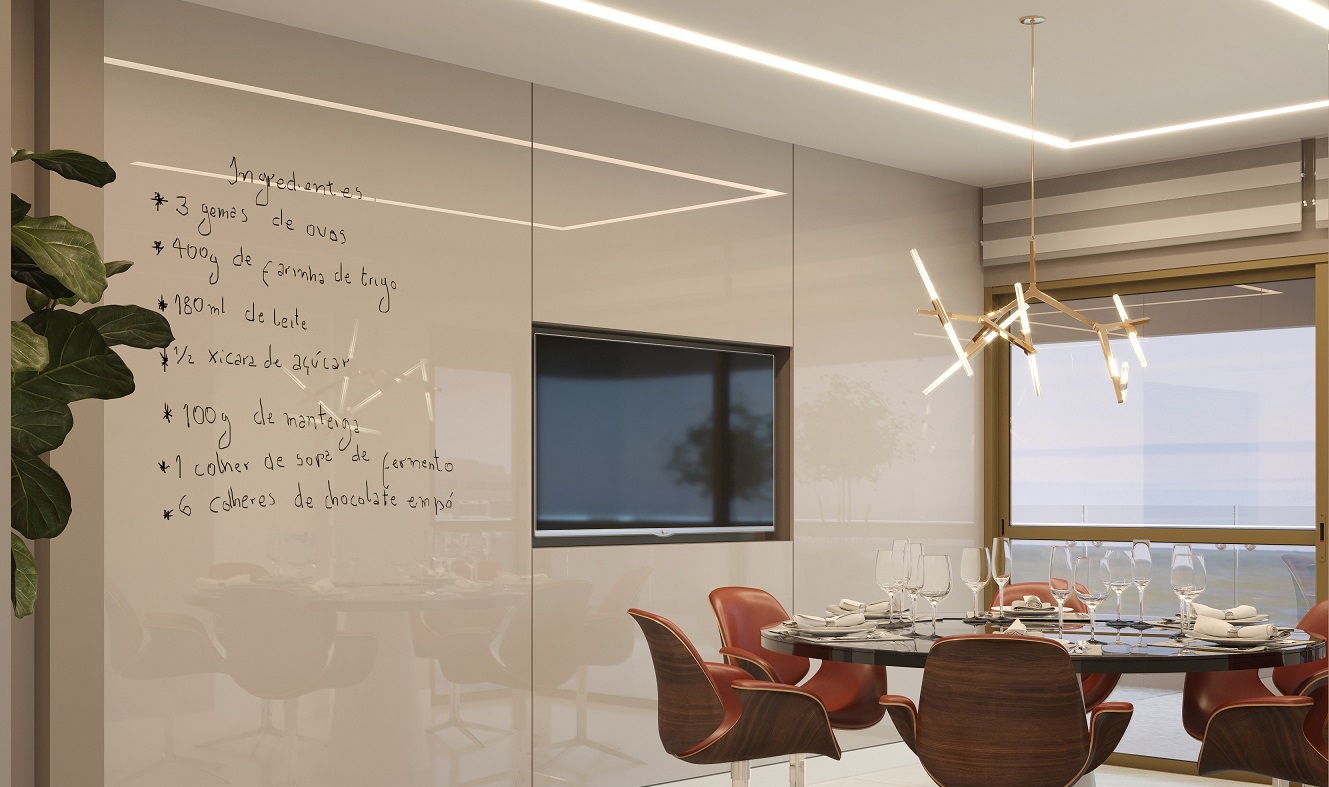O Studio Vivix, assinado pelo escritório Nejaim Azevedo Arquitetos Associados, foi o que recebeu a novidade em suas paredes acima da cama e no revestimento da mesinha lateral de cabeceira. As dimensões dos vidros pintados da marca que possuem 4mm, e dimensões de até 3300 x 2400, são aplicados como revestimento de uma outra infinidade de itens, para acrescentar sofisticação ao espaço escolhido.