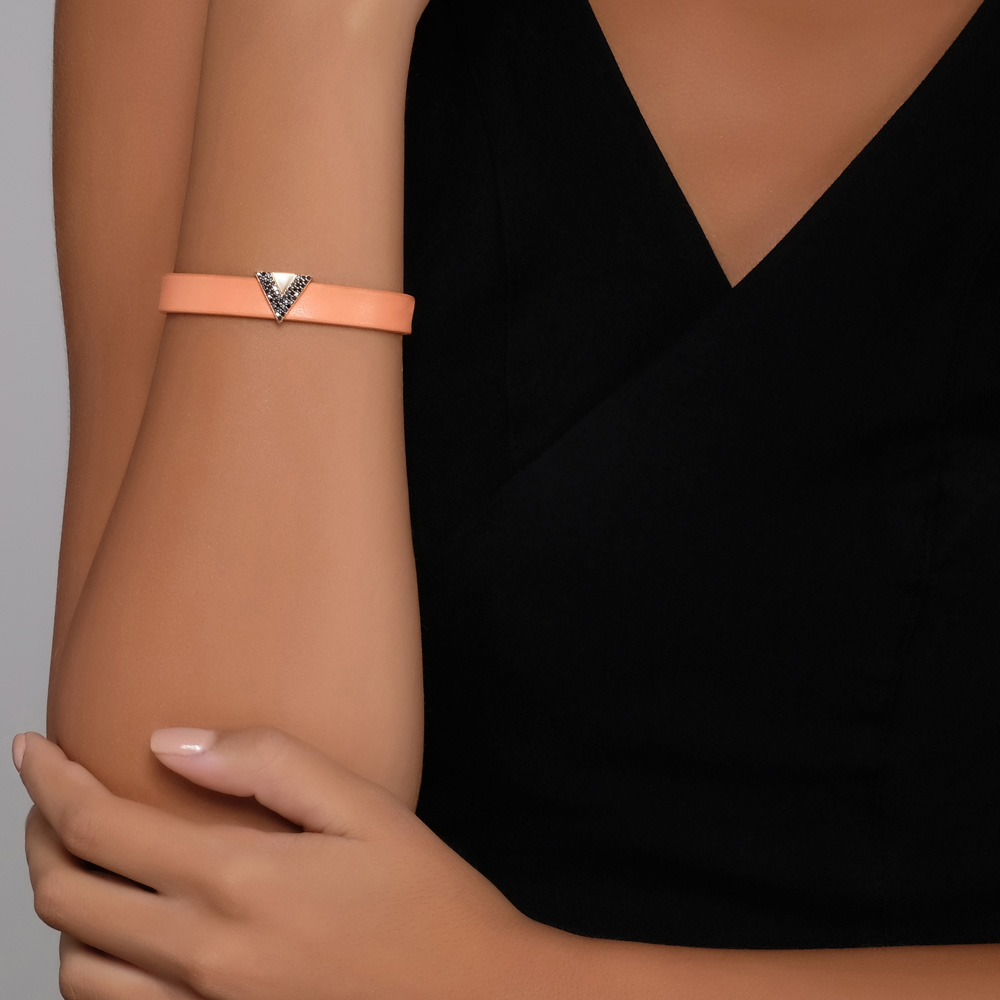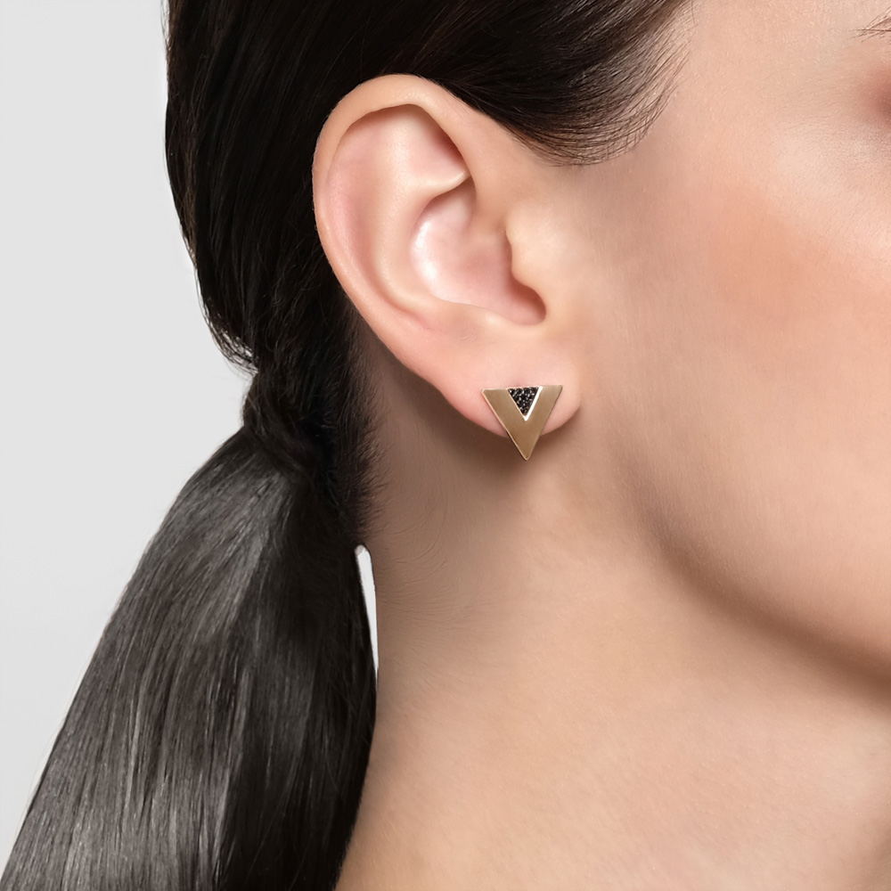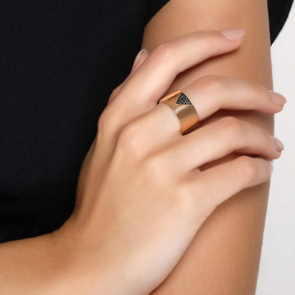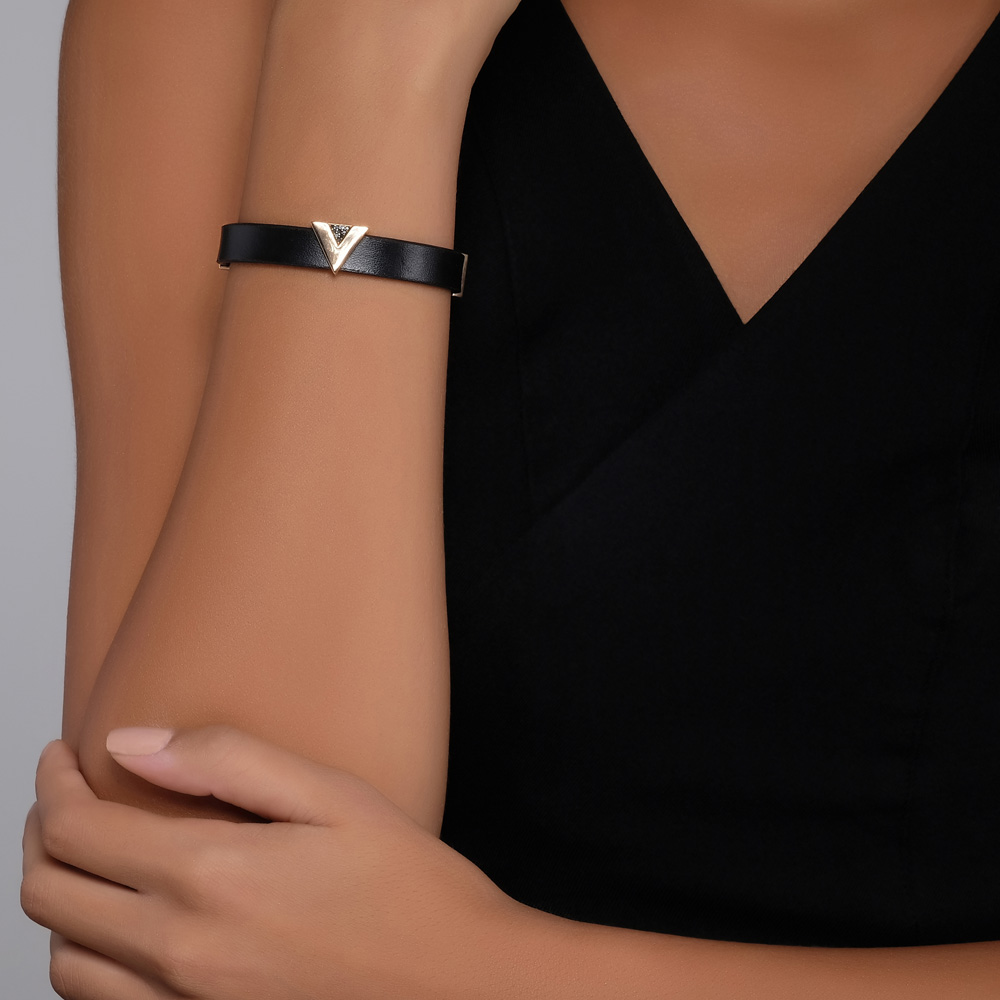 Composta por anéis, pulseiras e brincos, as joias da coleção, composta por Ouro Vivara, diamantes negros, e couro nas pulseiras, apresentam a ideia de singularidade e formas geométricas nos contornos do “V” da marca, reforçando o seu DNA.