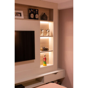 O projeto de reforma que busca ampliar o dormitório do casal para um novo espaço que atenda como Closet e Escritório, mas que também possa ser usado ocasionalmente como um quarto de hóspedes. Esse foi o desafio do arquiteto Rodolfo Medeiros, aplicar as múltiplas funções sem perder a identidade e individualidade do casal. A solução foi funcionalidade. Aproveitar uma das portas do Closet em L como passagem e fazer da profundidade do roupeiro um nicho para objetos de uso mais dinâmico. Cores claras e madeiradas na marcenaria; uma iluminação mais aconchegante para o dormitório e funcional no Closet/Office; e cores que fogem dos comuns neutros trazendo calor e personalidade. Para o dormitório foi usado a cor Petrolina e para os Closet/Escritório a cor Tabarana evidenciando ainda mais suas funções, mas todas em tintas acetinadas Toque da Seda Iquine.