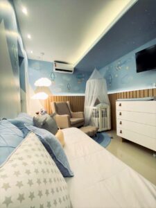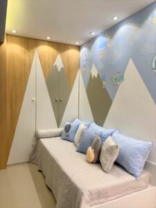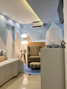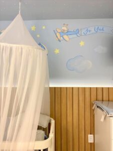 “ A pintura se torna uma ótima aliada em quartinhos de bebê, pois podemos com o profissional certo, para executar soltar a imaginação e deixar tudo bem criativo e personalizado, sempre prezando tons claros e amenos”, relata a arquiteta.