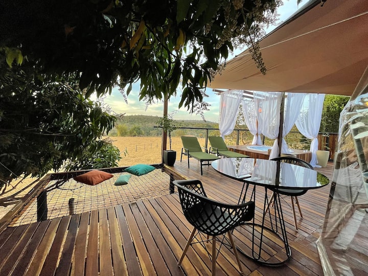A fachada do glamping permite que os hóspedes contemplem o amanhecer e o entardecer em meio a natureza do Cerrado, com as serras ao fundo compondo o cenário, além de que, junto a tenda, é disponibilizada uma área descoberta com rede horizontal suspensa e banheira de hidromassagem com cromoterapia, contando com quatro cores que possuem o objetivo de mudar as vibrações do corpo para a saúde, bem-estar e energia.