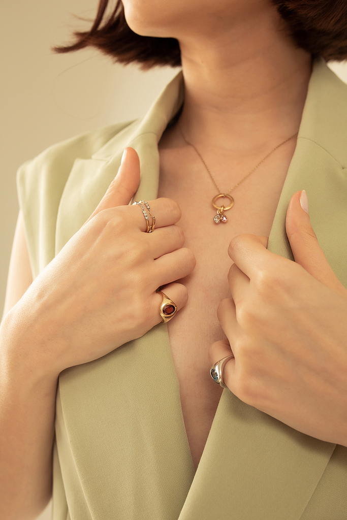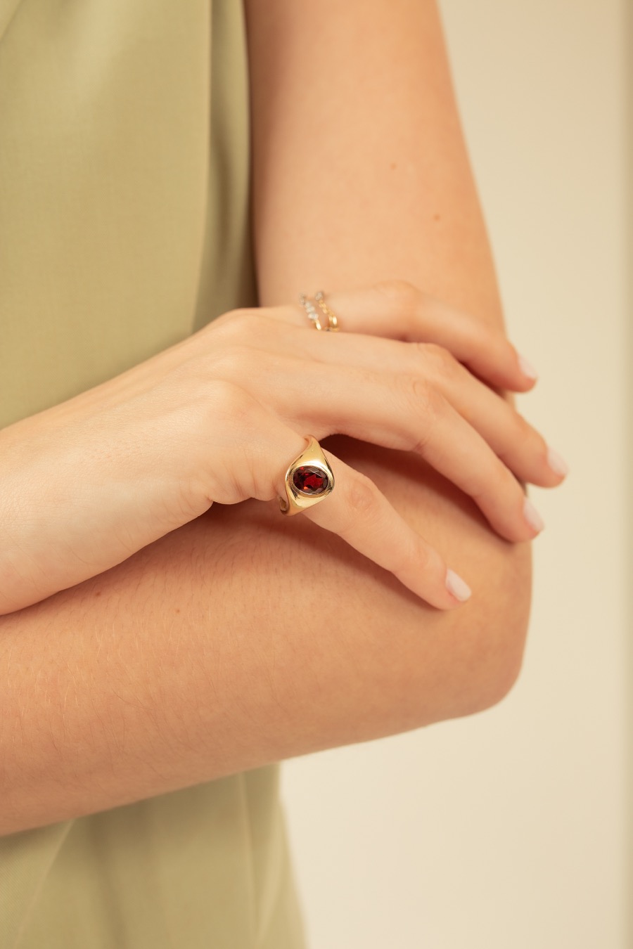 Por fim, o terceiro modelo é feito em ouro amarelo e combina a matéria prima com o vermelho passional da Granada, com uma proposta mais romântica e que ressalta sua transparência e nobreza.
