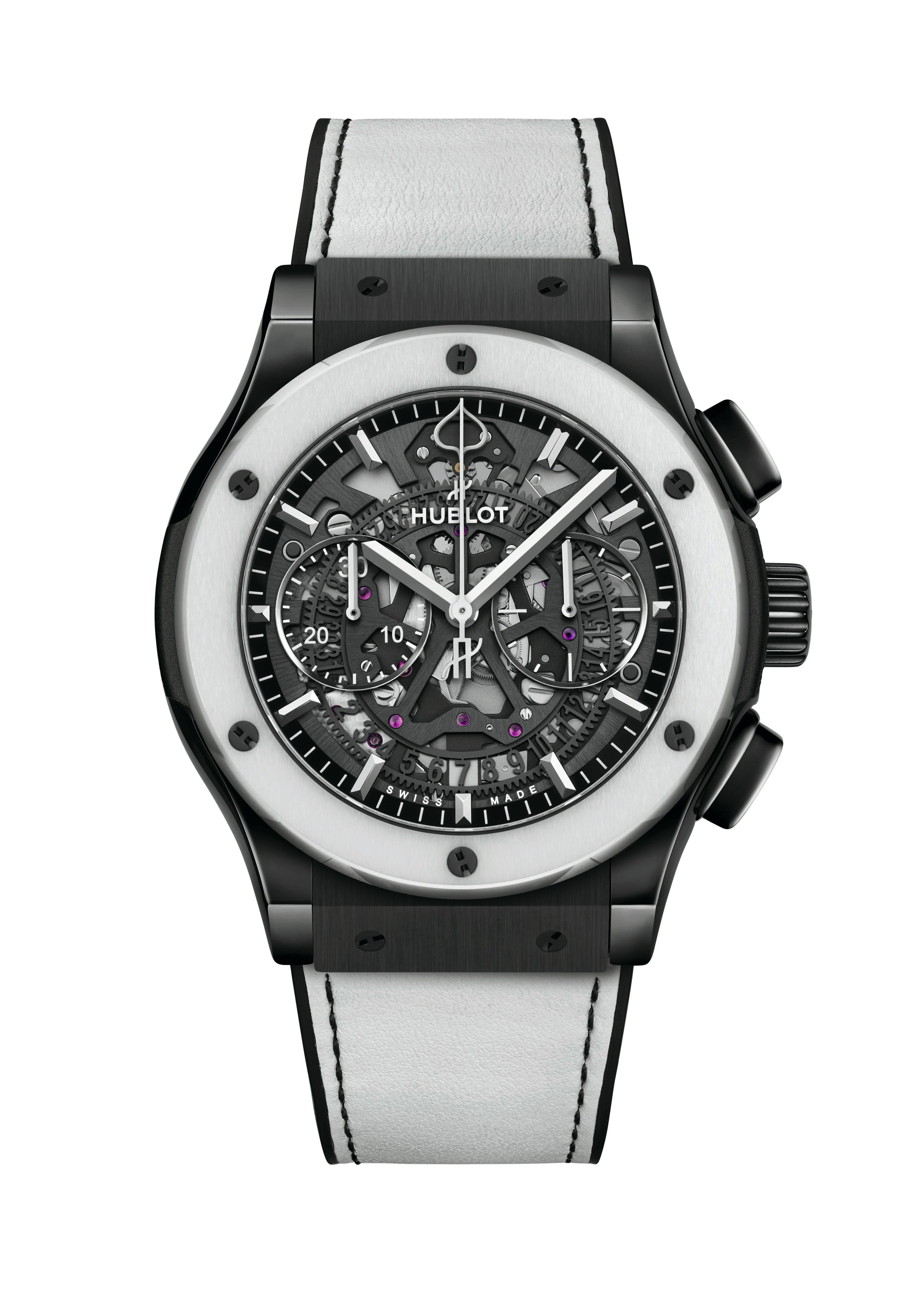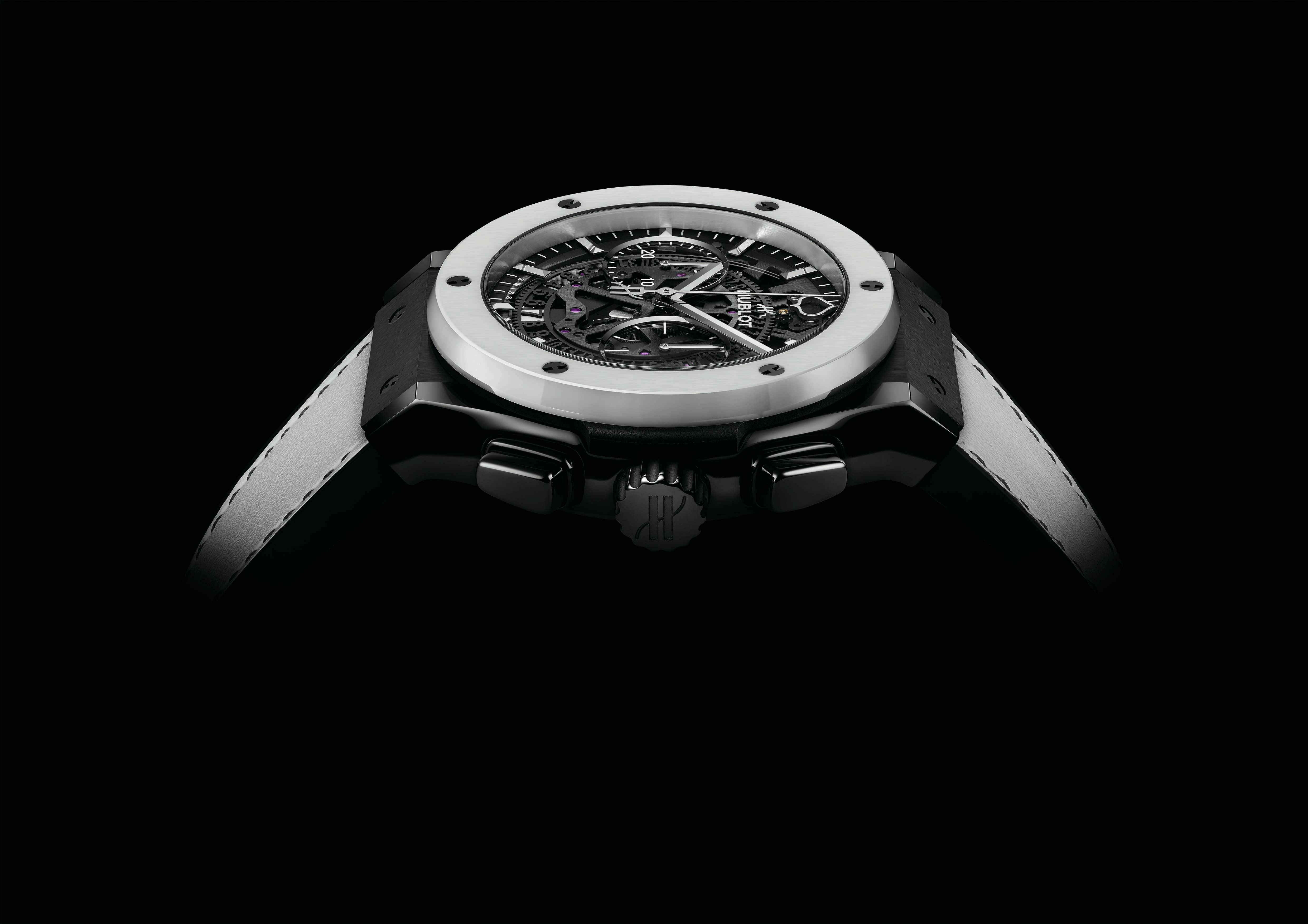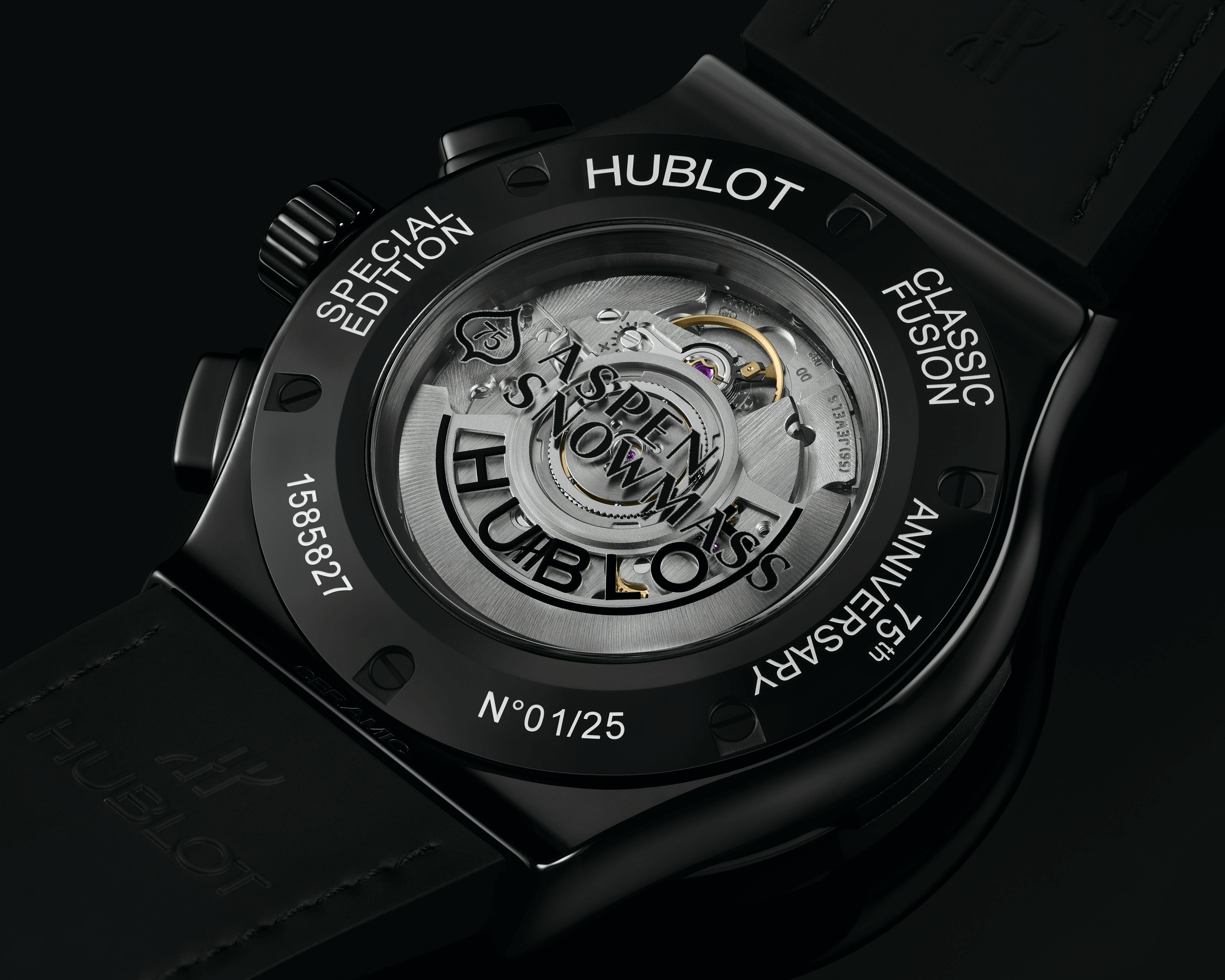 Intitulado como Classic Fusion Aerofusion Aspen Snowmass Limited Edition, o relógio abriga a fusão da cerâmica com a borracha, um interior esqueletizado e decorado do calibre HUB1155 da marca, além de que é totalmente feito sob medida para as pistas de esqui.