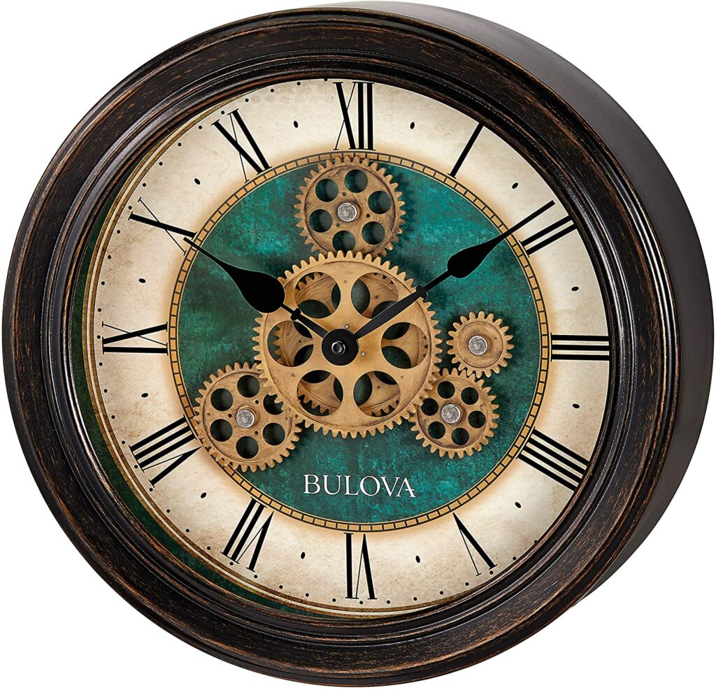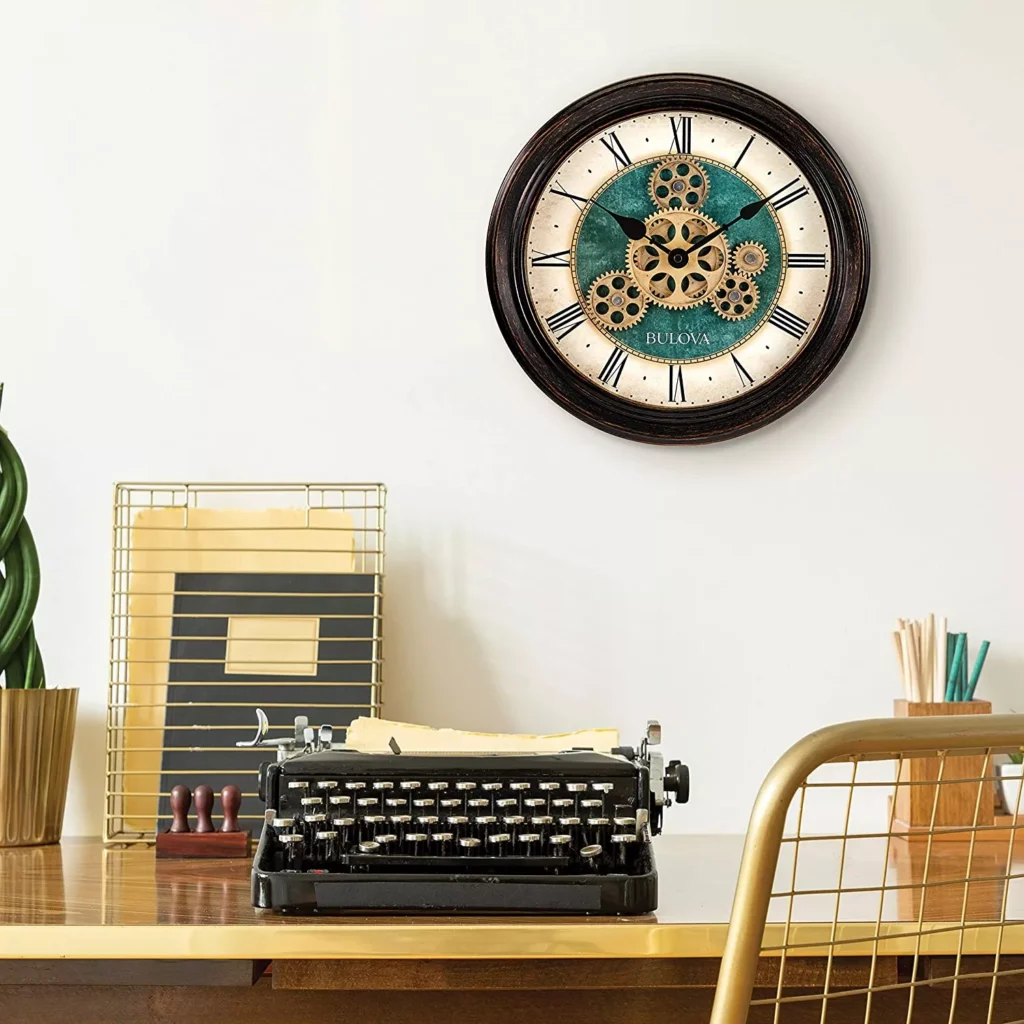 Desta forma, há um modelo clássico que mostra as engrenagens com acabamento em bronze e que se destaca como uma opção para criar uma combinação interessante, seja para uma ambientação rustica ou moderna. É o Bulova Relógio de parede com movimento industrial, 12,8, preto envelhecido cujas engrenagens contrastam com o tom de verde, os numerais romanos e a caixa em metal preto envelhecido. A lente, por sua vez, é feita de vidro.