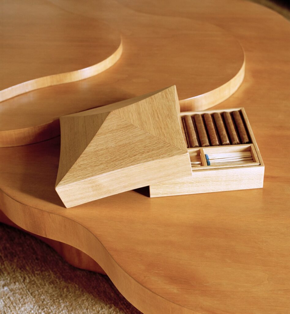 Yovanovitch assim encontrou ampla forragem nesses terrenos comuns e refletiu sobre as necessidades do Velho Mundo que poderiam ter existido em La Colle Noire, introduzindo itens básicos para uma casa em um contexto moderno. Assim, resulta a coleção Midi que inclui uma luminária de mesa elegantemente alargada, que ecoa as curvas dos móveis de sucesso de Yovanovitch. Enquanto isso, uma caixa de charutos esculpida à mão mantém a qualidade em mente, incorporado em sua tampa há um mostrador para medir a umidade.