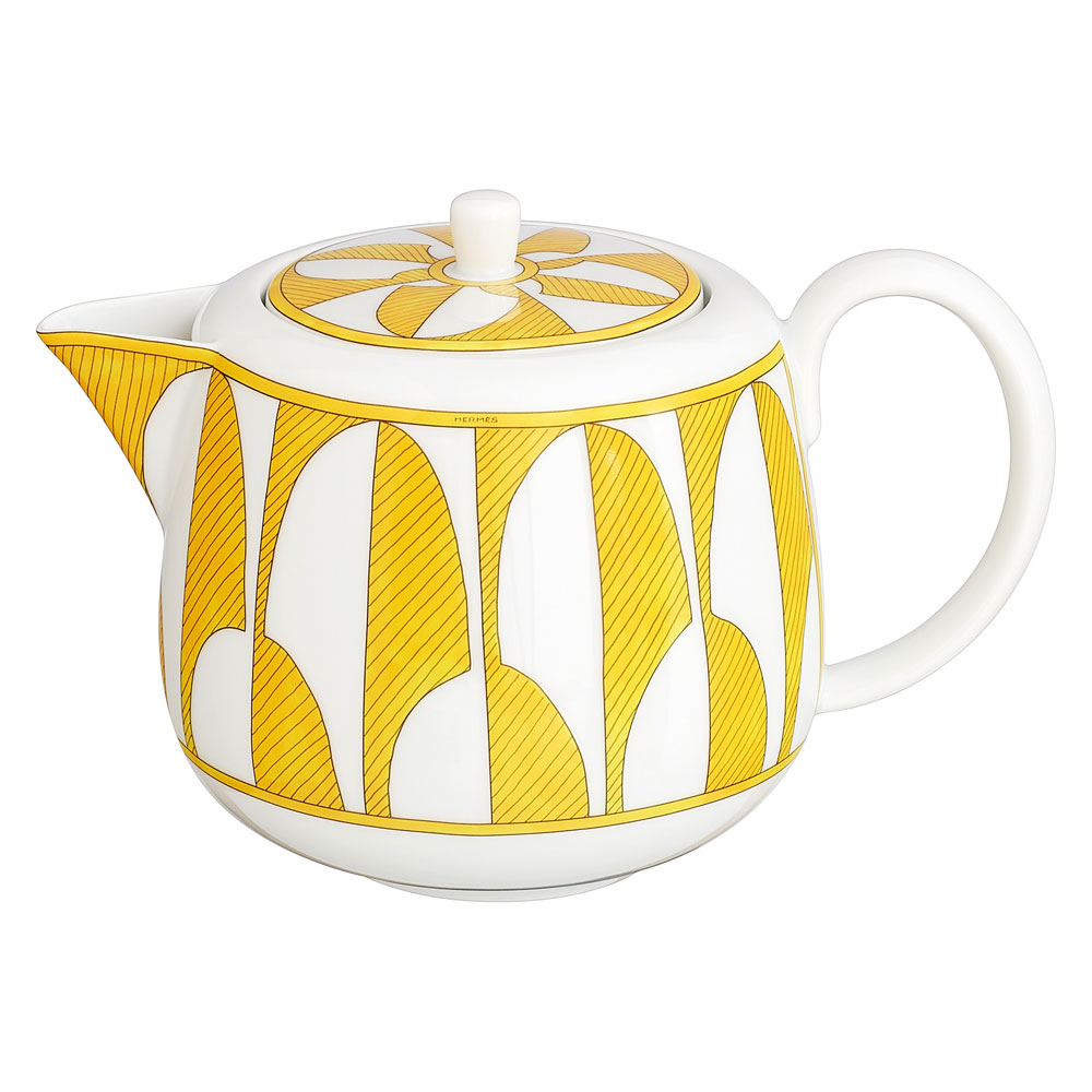 Possuindo como tema o “Lighthearted”, a coleção foi nomeada como “Soleil d’Hermès”, sendo composta por 24 peças onde o branco fresco é combinado com o amarelo alegre e delicadamente delineado em preto para evocar padrões modernos e gráficos como palmeiras estilizadas e outros motivos inspirados na Art Deco em itens essenciais de louça.