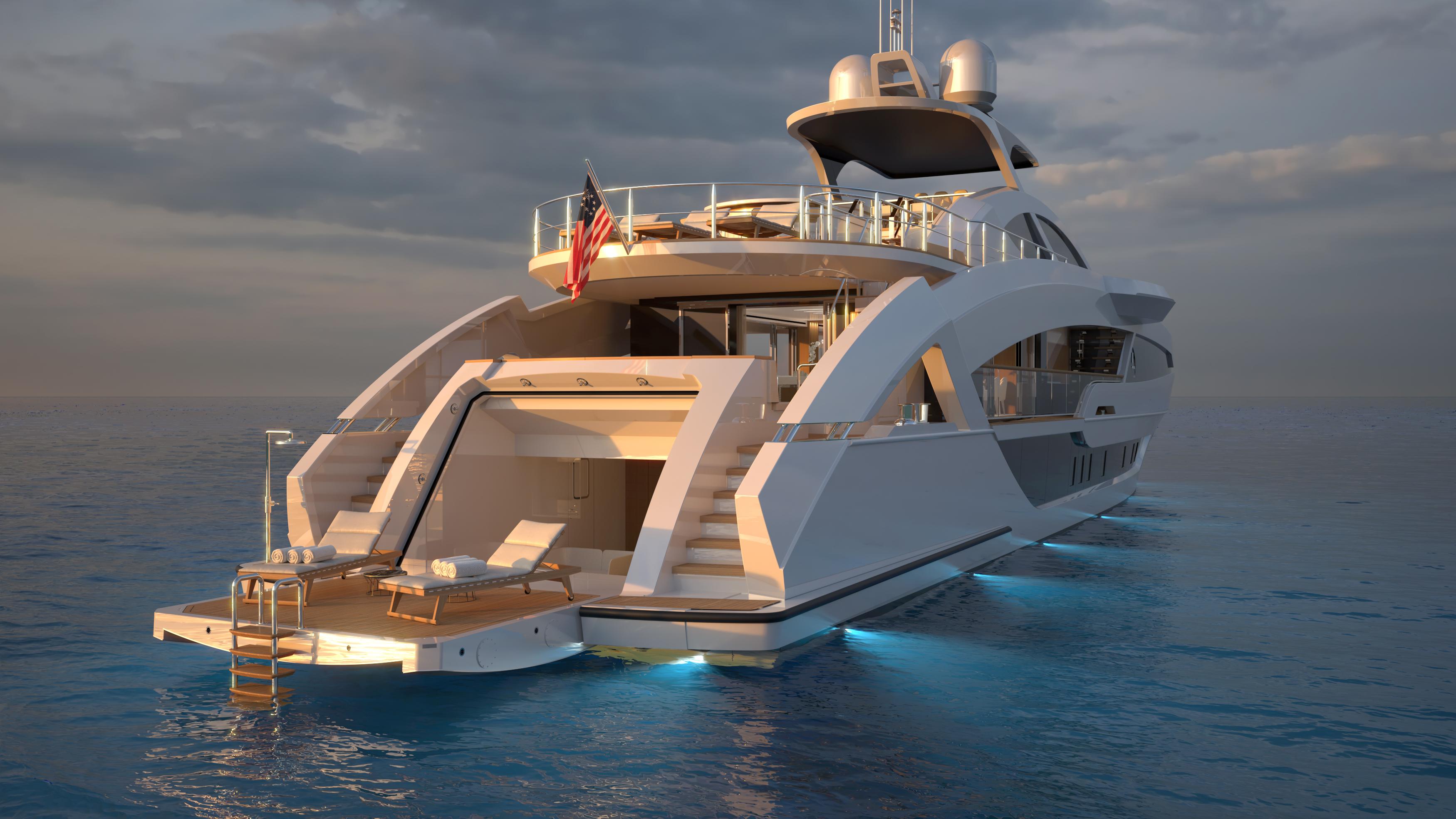 O flybridge abriga um convés próprio adornado por uma jacuzzi, a popa possui um clube de praia para tomar sol e se banhar no mar e o casco apresenta lâmpadas LED que, a noite, promovem aos tripulantes um verdadeiro espetáculos de luzes no meio do mar.