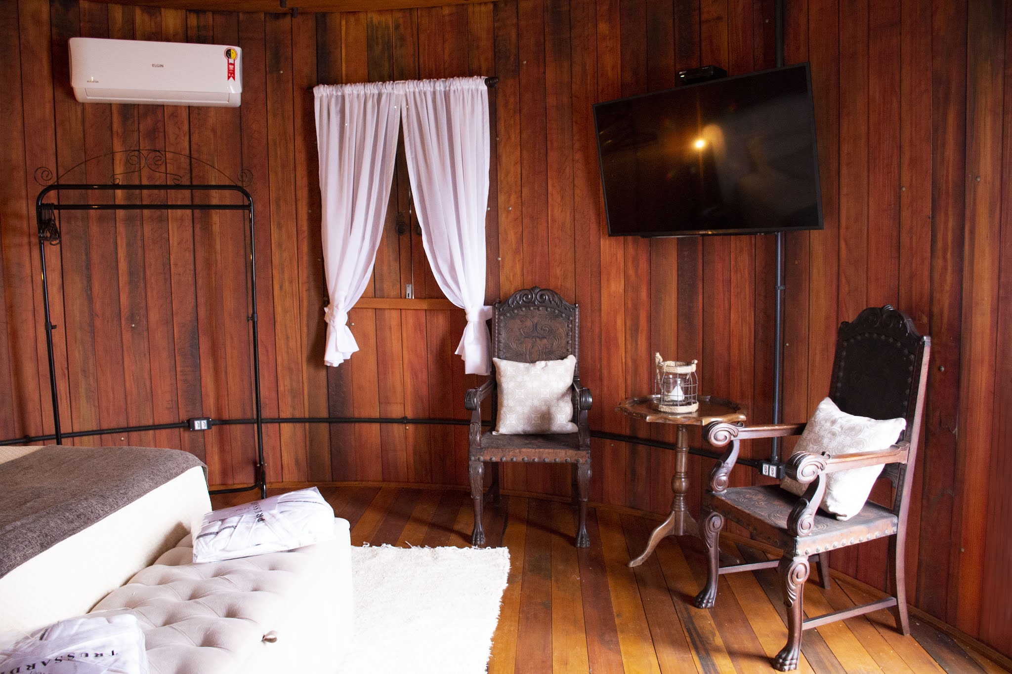 O chalé é dividido em dois ambientes, o piso inferior, que abriga sala e varanda, onde os hóspedes podem tomar café da manhã e relaxar na hidromassagem, e o piso superior, onde fica o quarto com janelas que proporcionam vistas panorâmicas para os belos vinhedos.
