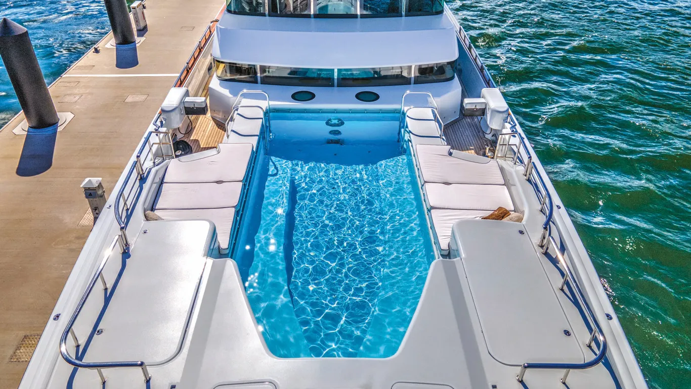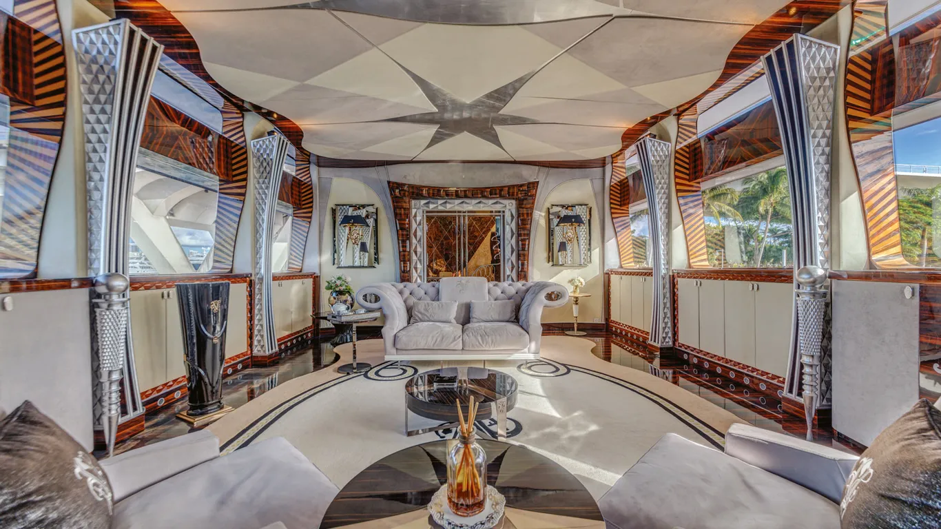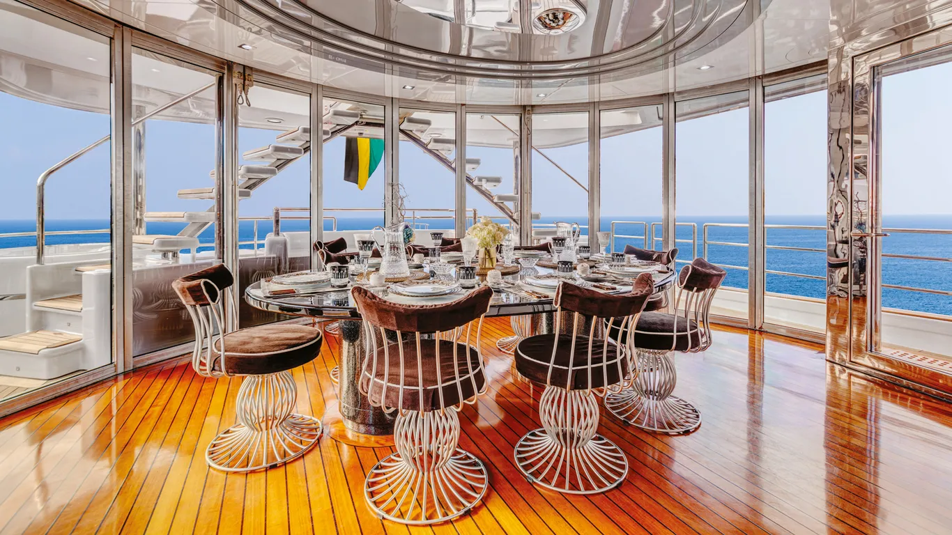 Nomeada como Thunder, a embarcação possui 50 metros, formas oblongas e nítidas e móveis estofados que se curvam e ondulam como um corpo, tendo como marca registrada a decoração, o mobiliário a altura e as janelas que vão do chão ao teto no salão principal.