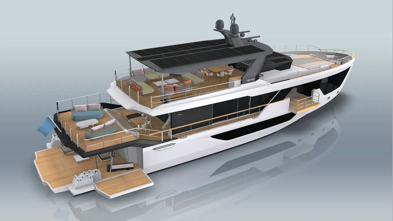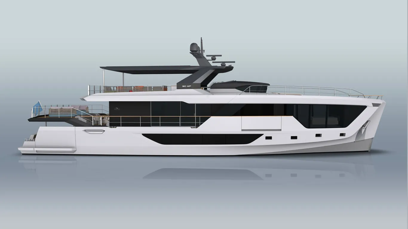 Nomeado como 30XP, o modelo possui 30,7 metros e oferece layout de cinco cabines que acomodam até dez convidados, onde a cabine principal está disposta no convés central da embarcação e se beneficia de janelas que vão do chão ao teto e uma varanda dobrável.