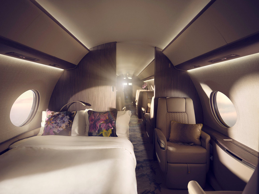 Em seu interior, pode acomodar até 19 passageiros, com 13 deles dormindo simultaneamente. Os assentos são feitos à mão e se convertem em camas. Além disso, possui 20 janelas ovais panorâmicas, maiores que as presentes em aeronaves comerciais. Disponibiliza também Wi-Fi de alta velocidade, ar fresco reabastecido a cada três minutos e sistema ionizante.