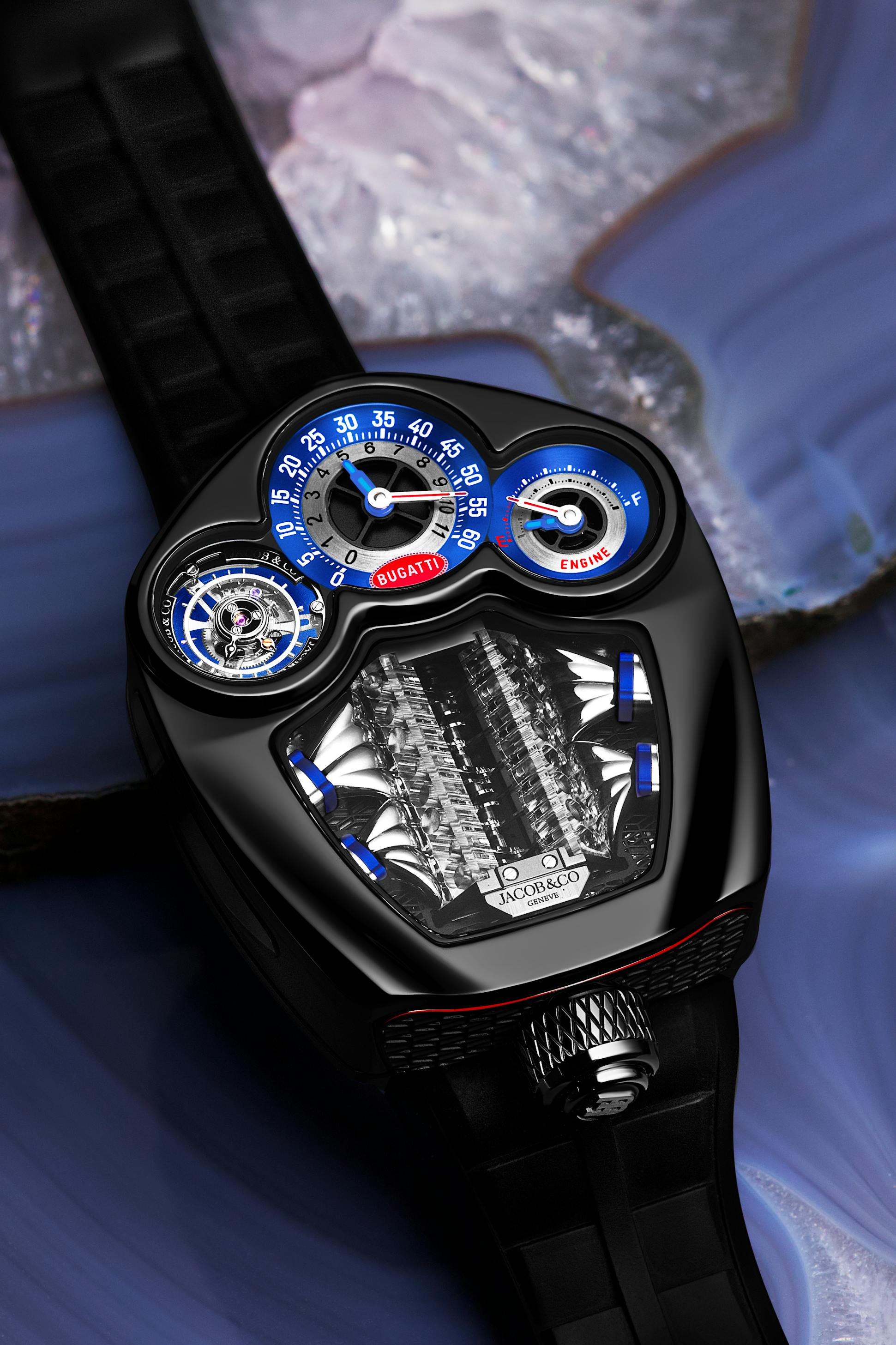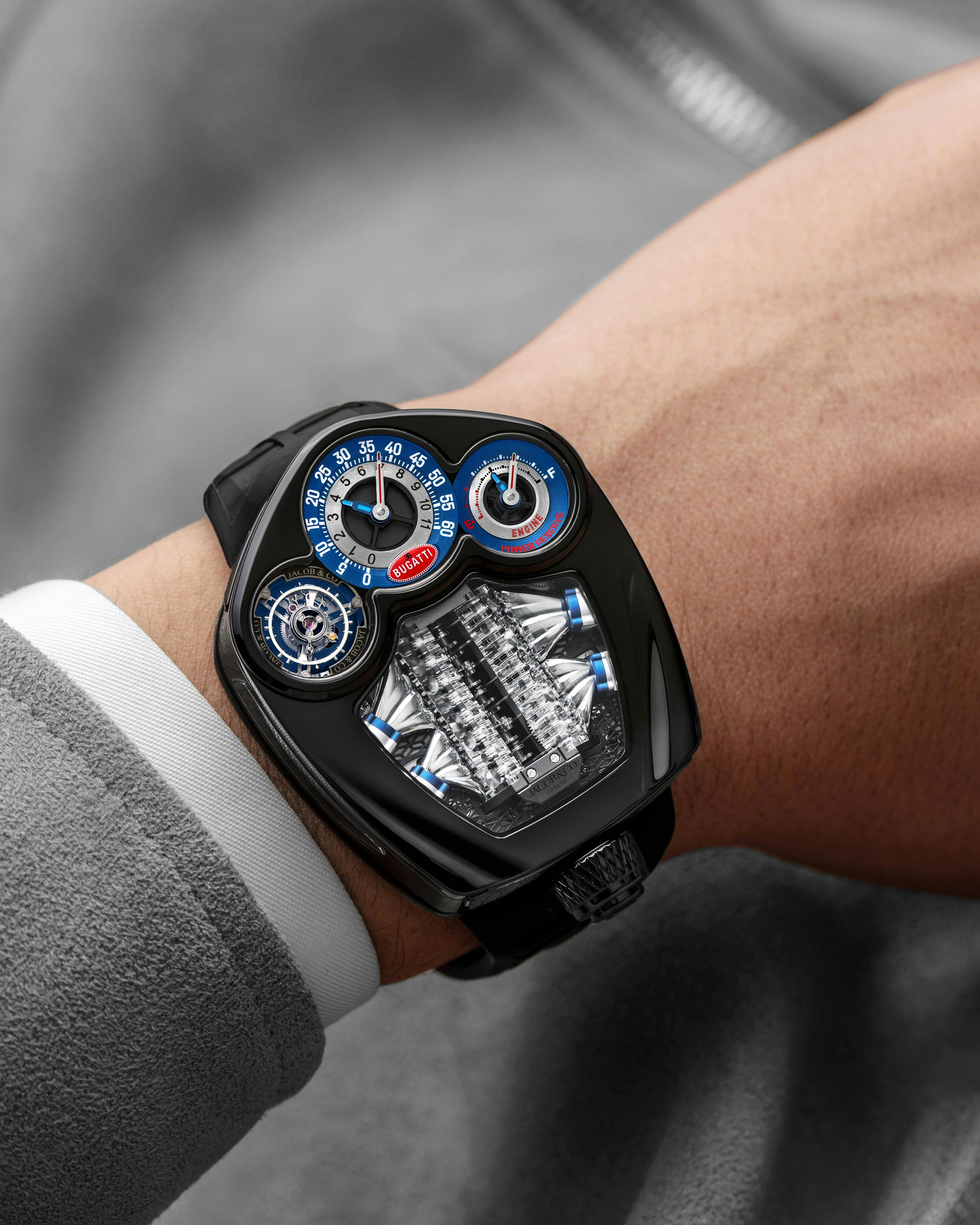 Também apresenta exibição totalmente panorâmica da réplica do motor V6 da Bugatti, feito de um único bloco de safira transparente, capaz de funcionar como o motor de combustão de 16 cilindros encontrado no veículo. Este lançamento está limitado à 250 unidades.