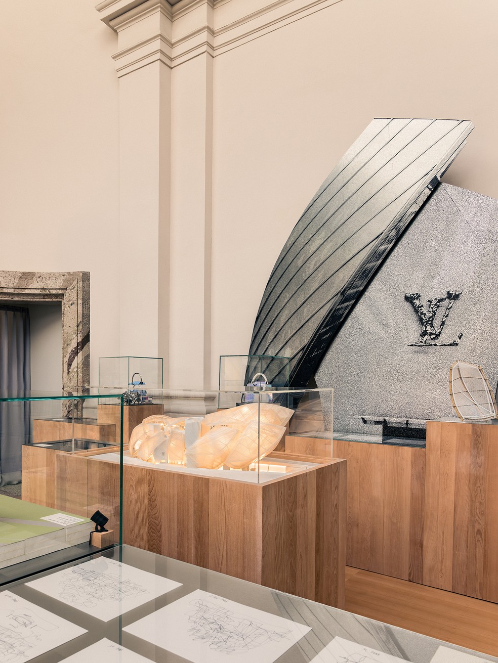 Podem ser vistos ali também os frascos de perfume que Frank Gehry desenhou para a Louis Vuitton, que abrigam as cinco fragrâncias da coleção Les Extraits, lançada em 2021 e maquetes da Maison Louis Vuitton em Seoul, primeiro espaço de varejo criado pelo arquiteto.