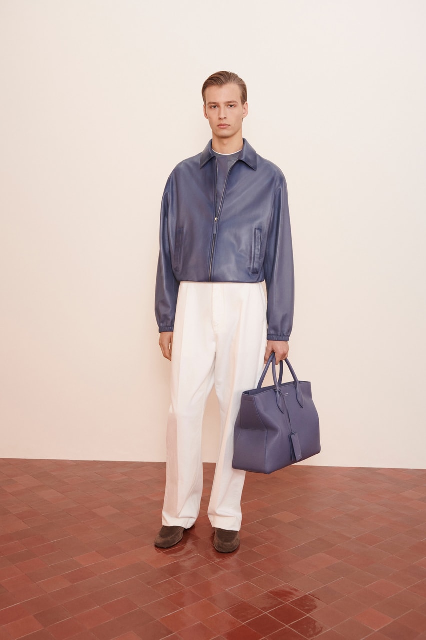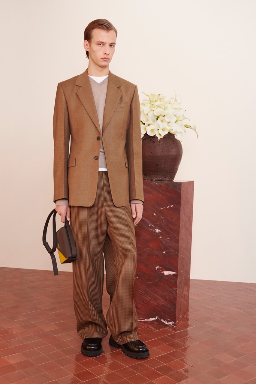 Sob a direção criativa de Maximilian Davis, a linha de roupas masculinas traz consigo pequenas doses de estilo contemporâneo, melhor representadas por um moletom de couro com acabamento verde floresta escuro e o emblema da Ferragamo. Novas versões de agasalhos de couro aparecem, ao lado de uma jaqueta curta em tom de azul e marrom. O terno é feito sob medida com perfeição em um visual slim, que compreende um blazer marrom claro, um suéter com decote em V cinza-claro e calças xadrez.