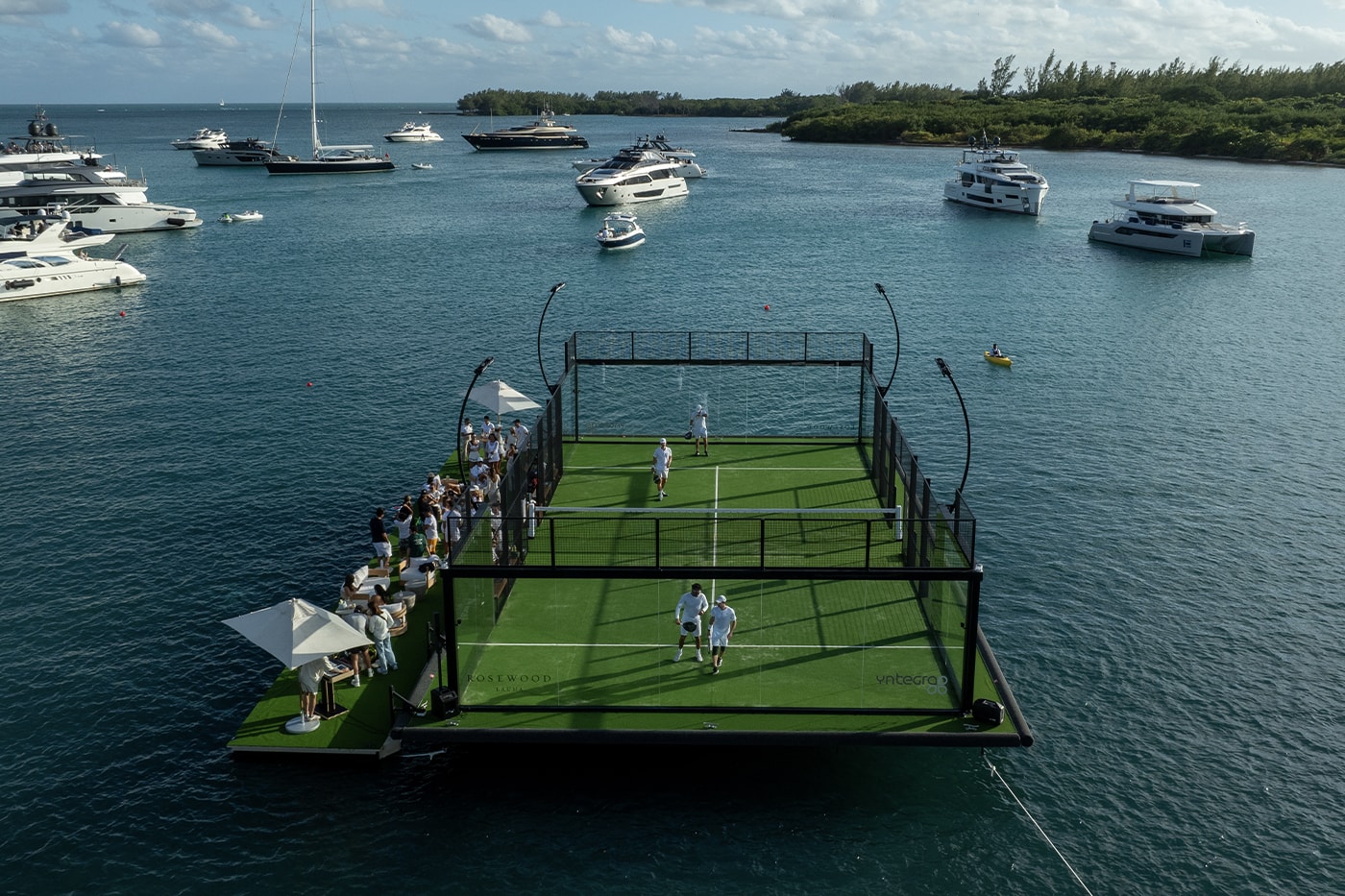 Esta novidade está localizada no Miami Harbor, na região próxima à icônica e luxuosa Fisher Island, ilha privada que é considerada um dos bairros mais ricos de todo Estados Unidos. A Quadra Flutuante de Padel foi projetada sob a visão de Felipe MacLean, CEO do Yntegra Group. Sua estrutura é feita de aço reciclado proveniente de materiais antigos de estaleiros. Livre de motores e baterias, a quadra se integra perfeitamente à paisagem natural, criando um ambiente tranquilo e único para a prática de padel.