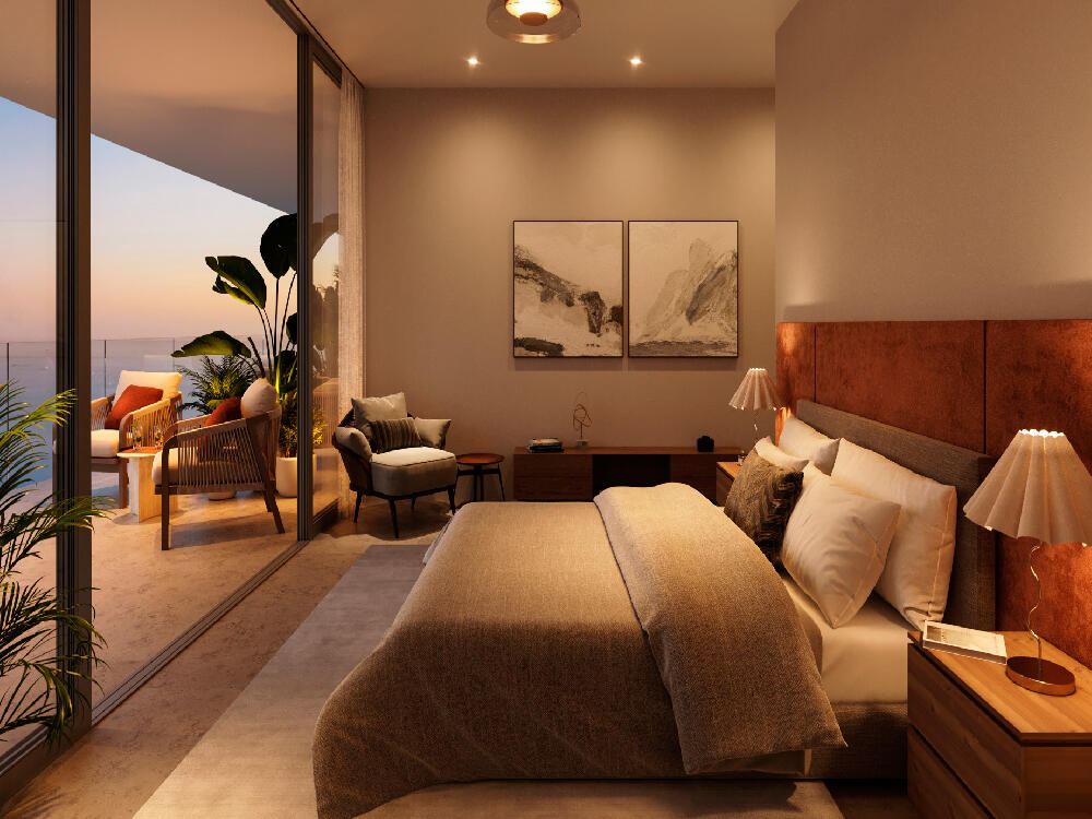 Cada apartamento possui janelas que vão do chão ao teto e portas de vidro deslizantes que se abrem para um terraço com vistas impressionantes da cidade e do mar. A paleta de cores reflete a natureza local, onde os interiores apresentam tons profundos de verde e muita vegetação exuberante. Já a entrada do edifício remete a um oásis de jardim, com paredes revestidas de azulejos verdes e uma passarela ladeada por plantas tropicais.