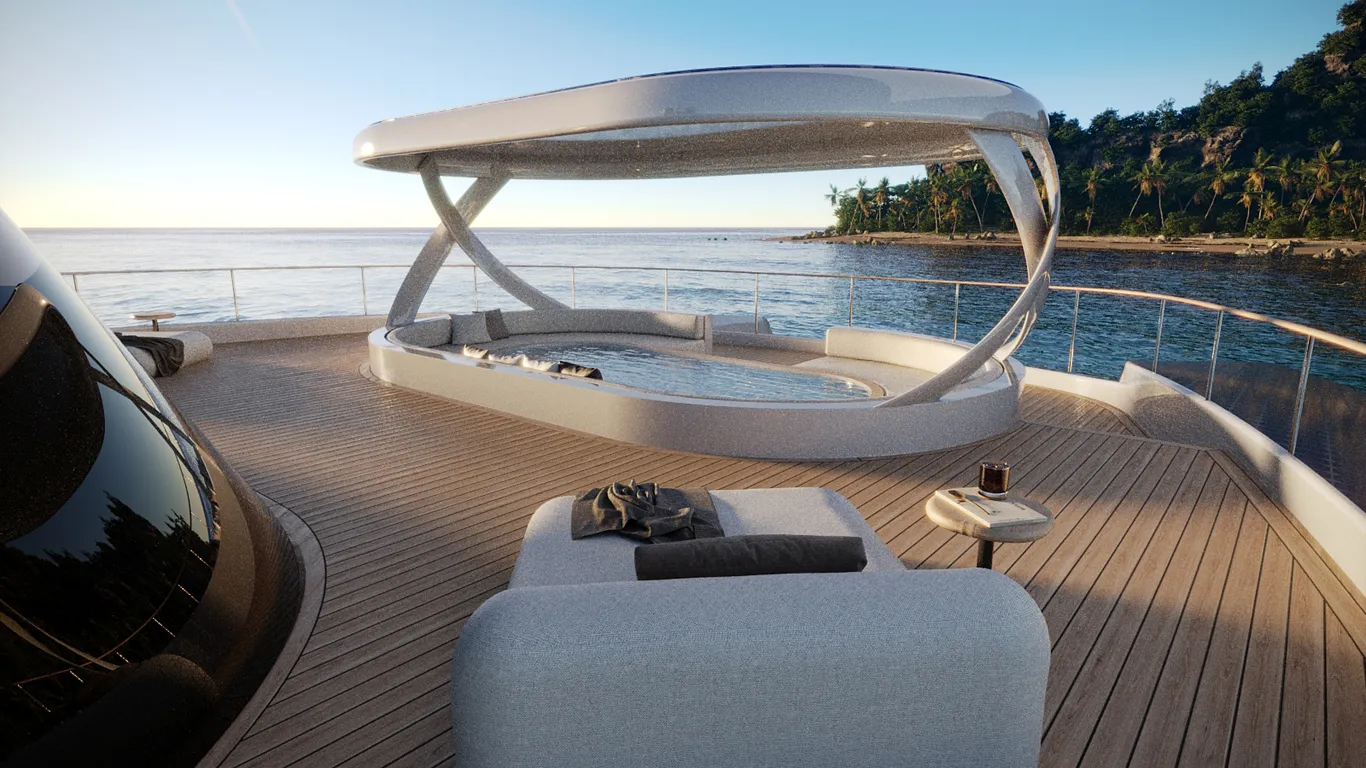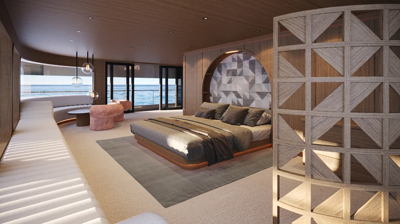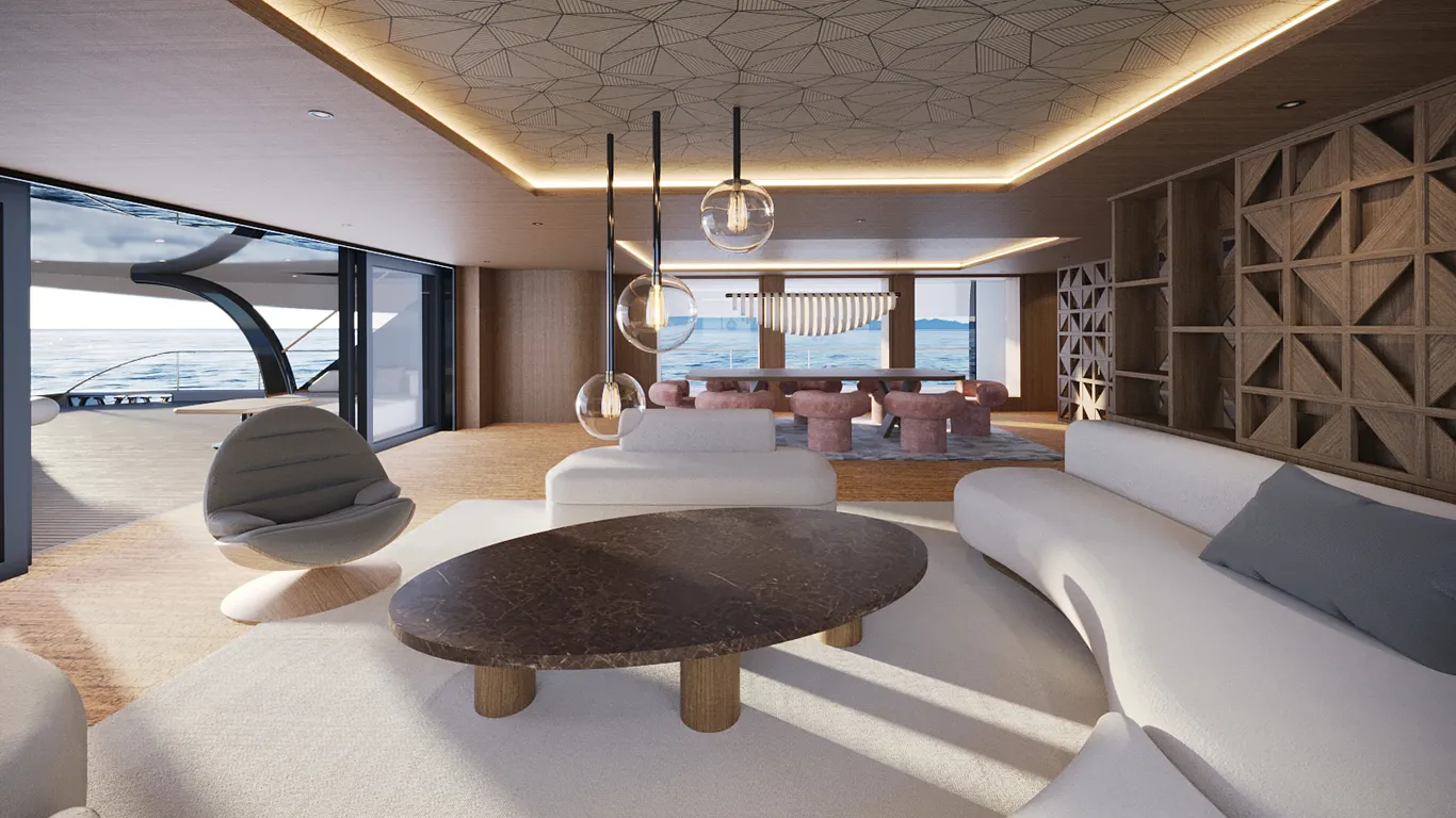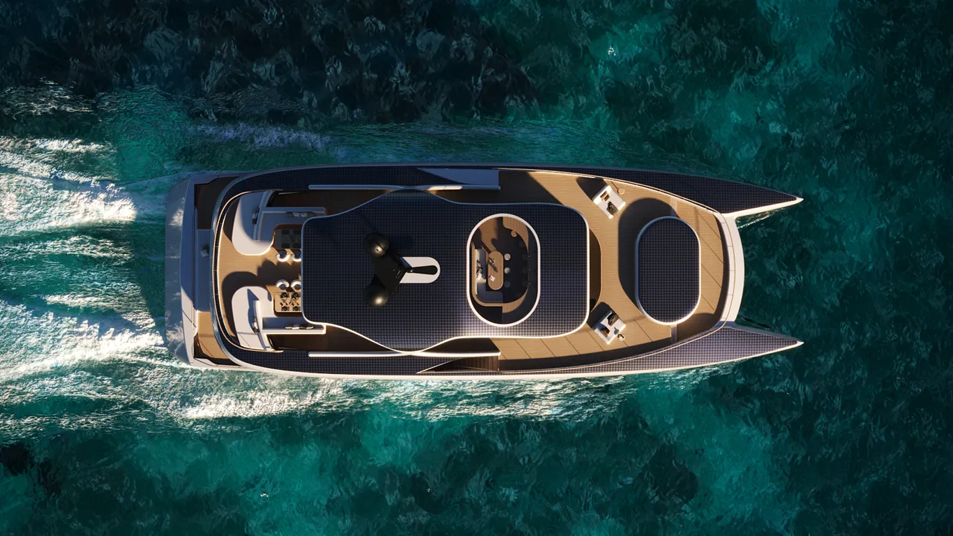 O designer também empregou plásticos oceânicos reciclados e painéis solares para aumentar a sustentabilidade do catamarã. O sistema de inteligência artificial aprimora o desempenho e a eficiência. Ele monitora continuamente as operações da embarcação, aprendendo com a observação e até mesmo antecipando as necessidades dos hóspedes.