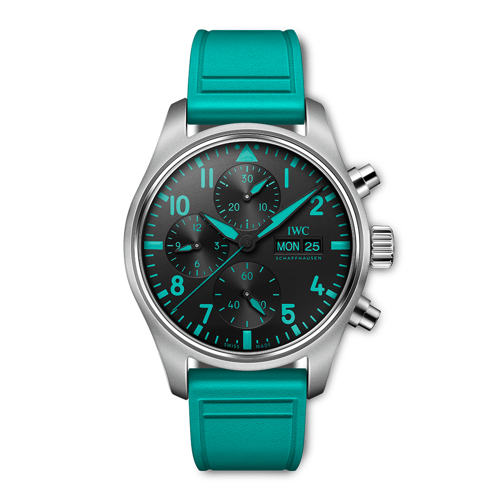 Nomeado como “Pilot Mark XX Mercedes-AMG Equipe PETRONAS Formula One”, o relógio apresenta uma caixa de 40 milímetros feita de um material leve e notavelmente rígido, o titânio grau 5. Números e índices impressos na cor verde característica da equipe PETRONAS, contrastam com o preto do dial. Os ponteiros das horas, minutos e segundos estão revestidos com Super-LumiNova da mesma cor.