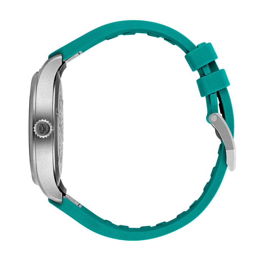 Já o fundo da caixa é gravado com pequenos hexágonos e também com a frase “Equipe Mercedes-AMG PETRONAS F1”. Resistente à água até cerca de 100 metros de profundidade, o relógio é equipado com uma pulseira de borracha verde Petronas com o sistema de troca EasX-CHANGE.