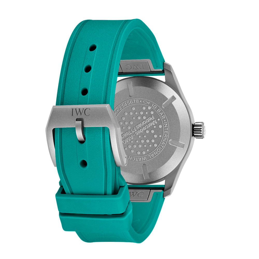 Nomeado como “Pilot Mark XX Mercedes-AMG Equipe PETRONAS Formula One”, o relógio apresenta uma caixa de 40 milímetros feita de um material leve e notavelmente rígido, o titânio grau 5. Números e índices impressos na cor verde característica da equipe PETRONAS, contrastam com o preto do dial. Os ponteiros das horas, minutos e segundos estão revestidos com Super-LumiNova da mesma cor.