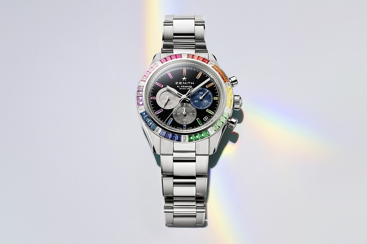 Para a ocasião, a Zenith apresentou duas novidades, a primeira é uma ousada versão arco-íris do Chronomaster Sport, que vem em caixa de ouro branco de 18 quilates, além de bezel cravejado no estilo arco-íris com 50 pedras preciosas em lapidação baguette. Para alternar o estilo e preservar a legibilidade, uma paleta brilhante e colorida de 40 safiras é alternada com 10 diamantes lapidação baguette. Para melhorar a legibilidade no escuro, os ponteiros das horas e dos minutos facetados incorporam Super-LumiNova.