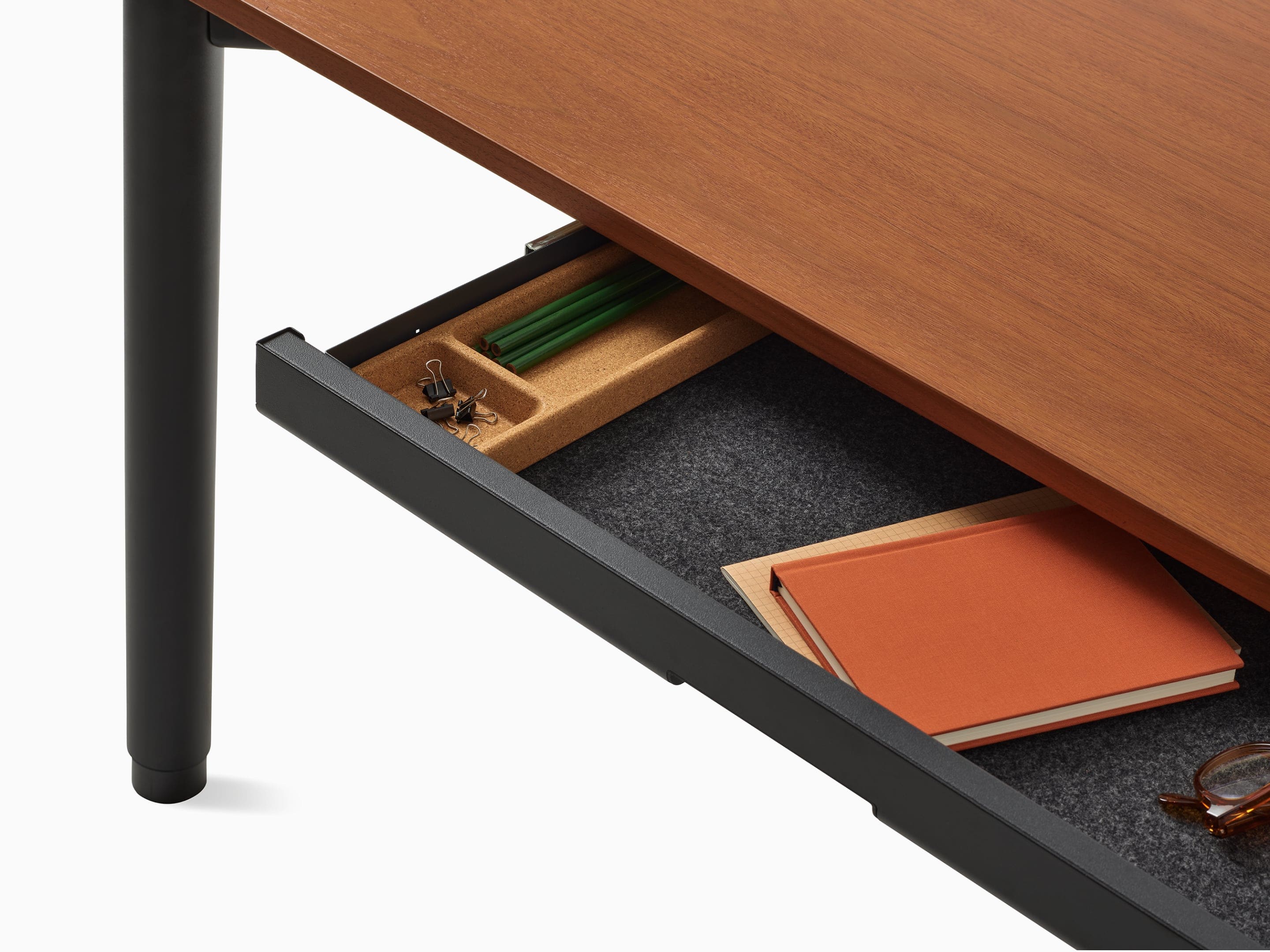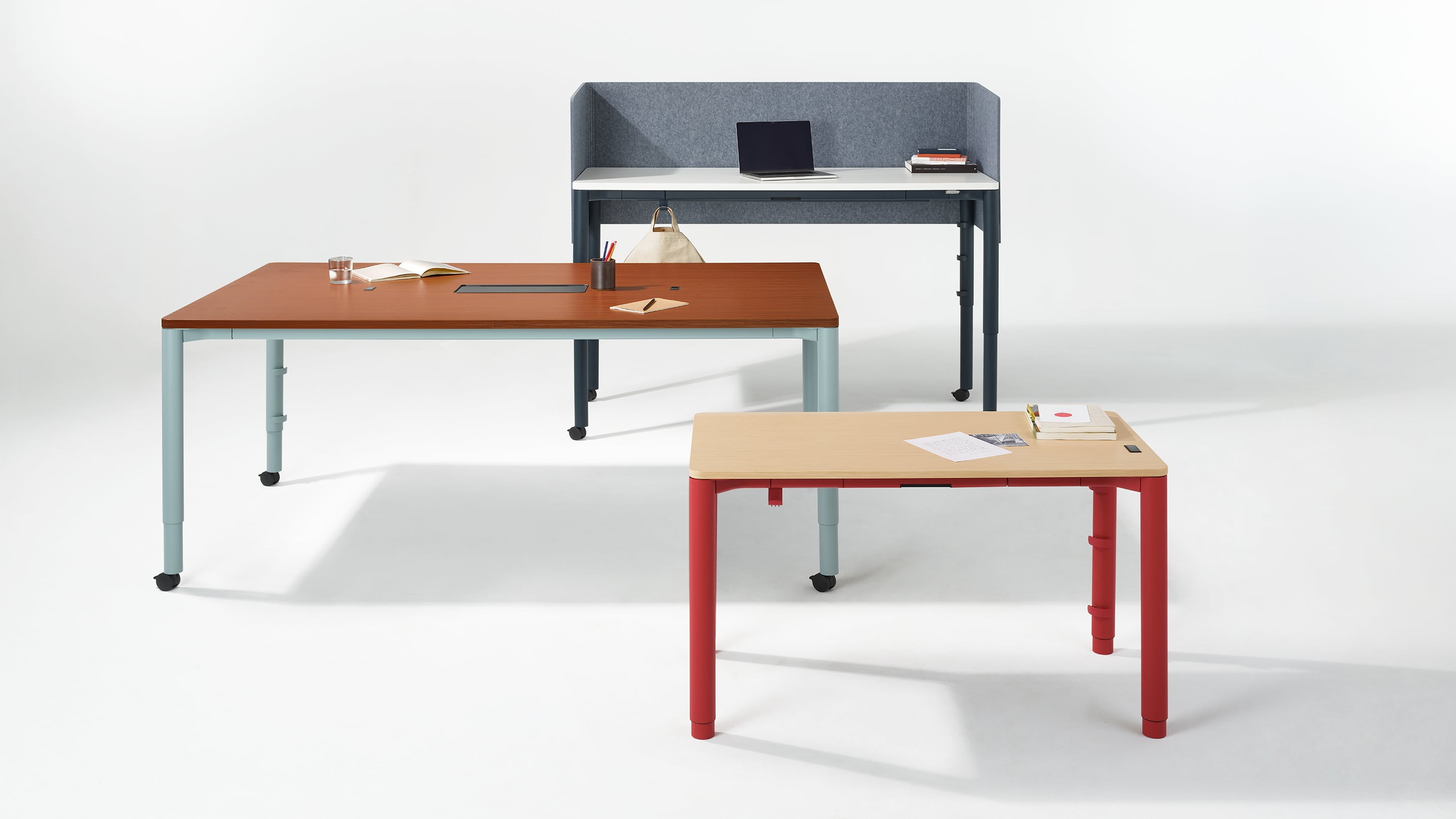 Conta com um leque de cores e acabamentos sofisticados, se encaixando em diversos estilos de decoração. O gerenciamento de cabos é outro diferencial: com organizadores magnéticos e uma bandeja opcional, a mesa reduz a poluição visual do espaço de trabalho. Ela também é a primeira a incorporar a tecnologia Ello Power Access Solutions, uma nova solução de energia da Herman Miller para ambientes comerciais.