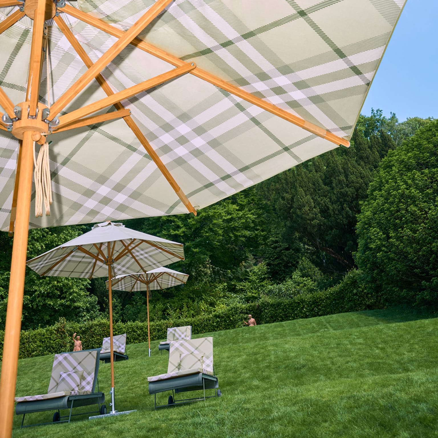 Para adicionar seu toque, a Burberry projetou um padrão de verificação personalizado com o verde simbólico do hotel. O padrão de assinatura está embelezando carrinhos de golfe, espreguiçadeiras e o gramado de croquet do The Newt durante este verão. A boutique tem roupas disponíveis da coleção Summer 2025 da Burberry, incluindo o maiô, chapéus e guarda-chuvas.