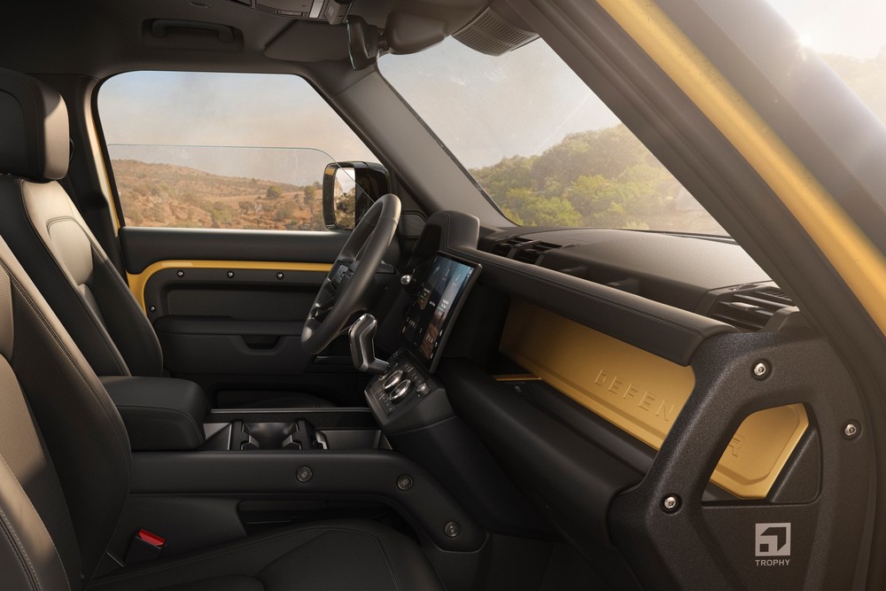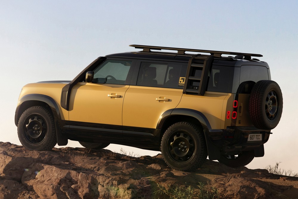 Nomeado como Defender 110 Trophy Edition, o veículo celebra a volta da marca britânica aos eventos internacionais de expedição, onde, em seu exterior, destaca-se adesivos exclusivos Trophy adornando o capô, colunas C, tampa traseira em preto brilhante, rodas de 20 polegadas e adesivo alusivo à versão na traseira, além de para-choque mais robusto.