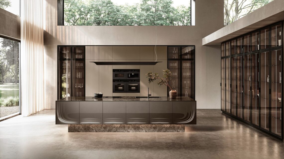 Além disso, é visualmente tátil através do uso da materialidade, com a ilha de cozinha e o aparador assumindo uma forma escultural e brincando com a percepção espacial. A Ilha Onda foi projetada para ser a peça central de um espaço de cozinha. O comprimento é personalizável, enquanto a profundidade é fixa. Ela é feita com estrutura de alumínio e portas de vidro lisas com efeito metálico, e as cores variam de “Bronze” a “Champagne”. Há opções de fogão integrado, com coifa e pia, além de módulos que podem abrigar gavetas, bandejas e bandejas deslizantes.