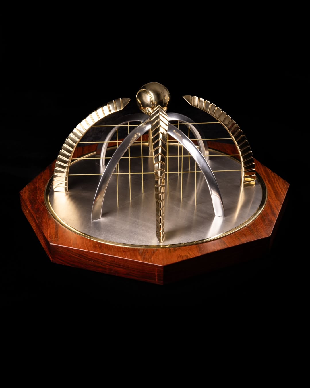 A escultura, que leva assinatura de um dos nomes mais relevantes da joalheria contemporânea, possui 53 cm de largura e comprimento, 25 cm de altura e cerca de 10kg. Possui inspiração no Marco Zero de São Paulo, partindo de um marco geográfico e cultural. Com base em madeira jatobá e parte metálica modelada digitalmente, finalizada com impressão 3D e fundição em areia, combina latão, alumínio, aço inoxidável e fios reais de raquete.