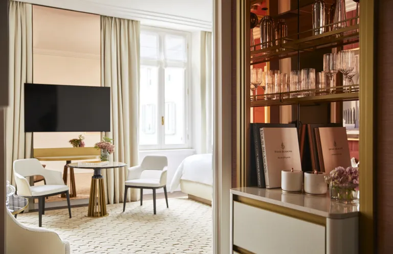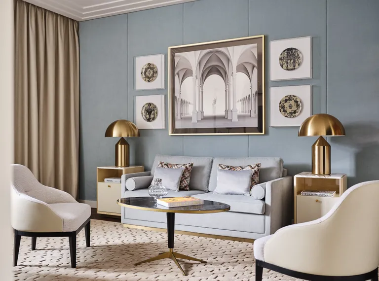 Duas suítes de destaque apresentam detalhes decorativos que fascinam seus ocupantes há séculos. A primeira é a Suíte Fresco, um espaço em estilo estúdio cujo teto apresenta um afresco pintado à mão, semelhante ao encontrado na entrada do hotel. Rochon se inspirou na obra de arte, concluída por Giocondo Albertolli no século 18, projetando o quarto em torno de uma paleta de cores que ecoa sutilmente seus tons de amarelo e pêssego.