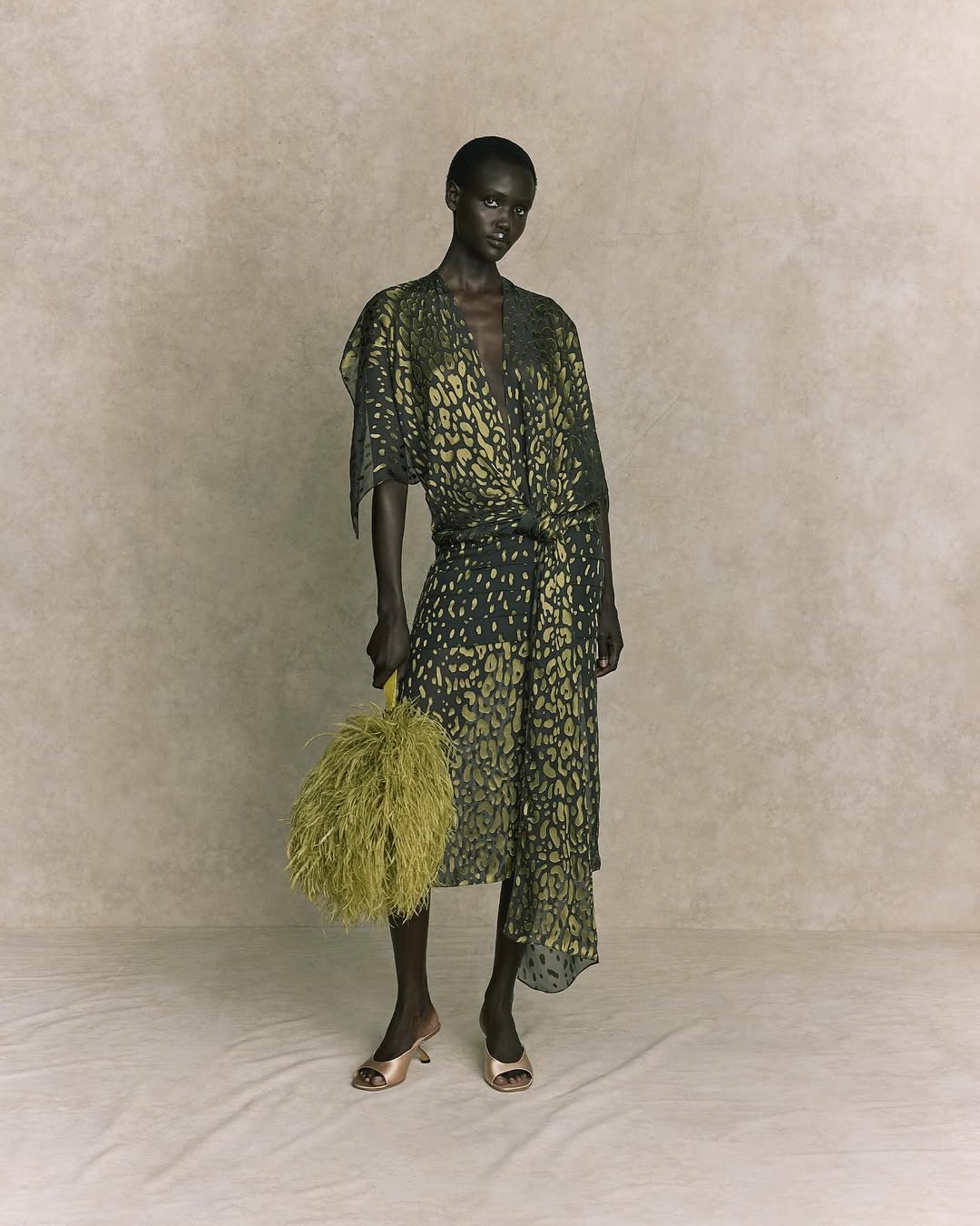 Vale destacar que, a principal inspiração para a idealização desta coleção partiu de uma foto de 1925 da estrela do cinema mudo Lola Todd, envolta em uma estampa de leopardo da cabeça aos pés. Dessa imagem nasceram as animal prints que se espalharam pela passarela, transformando esses códigos em desejo atual, evocando o jazz e a liberdade feminina que moldou a época.