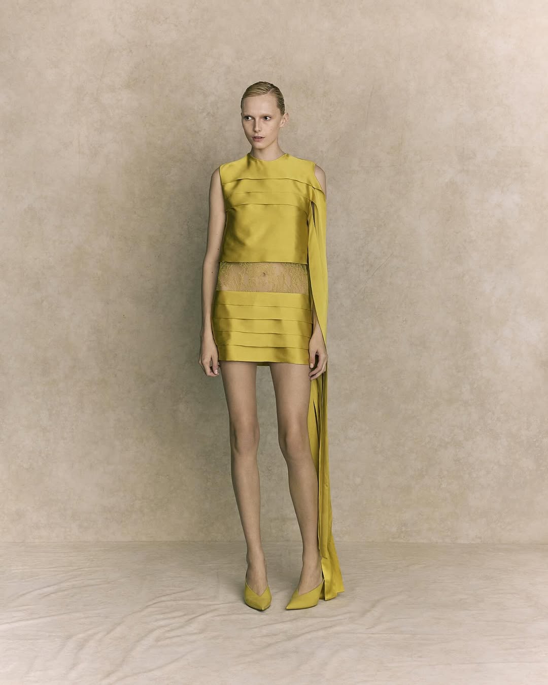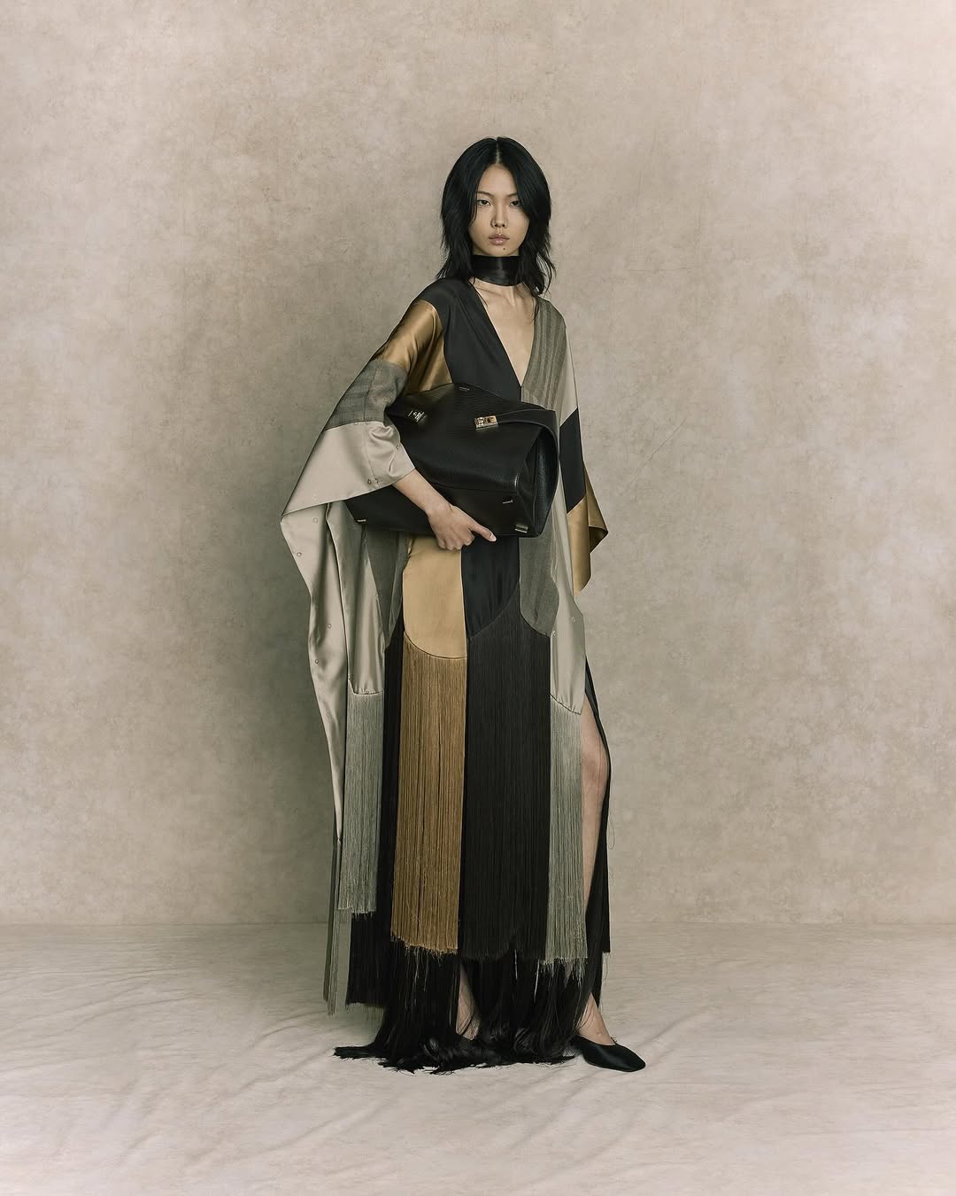 Na passarela, a alfaiataria aparece como contraponto das propostas mais fluidas, destacando ternos de ombros largos ajustados por faixas de cetim que lembram gravatas. Já nos acessórios, os sapatos de bico fino ganharam protagonismo, assim como as bolsas Hug que ganharam versões envernizadas, trançadas em couro ou cobertas por plumas.