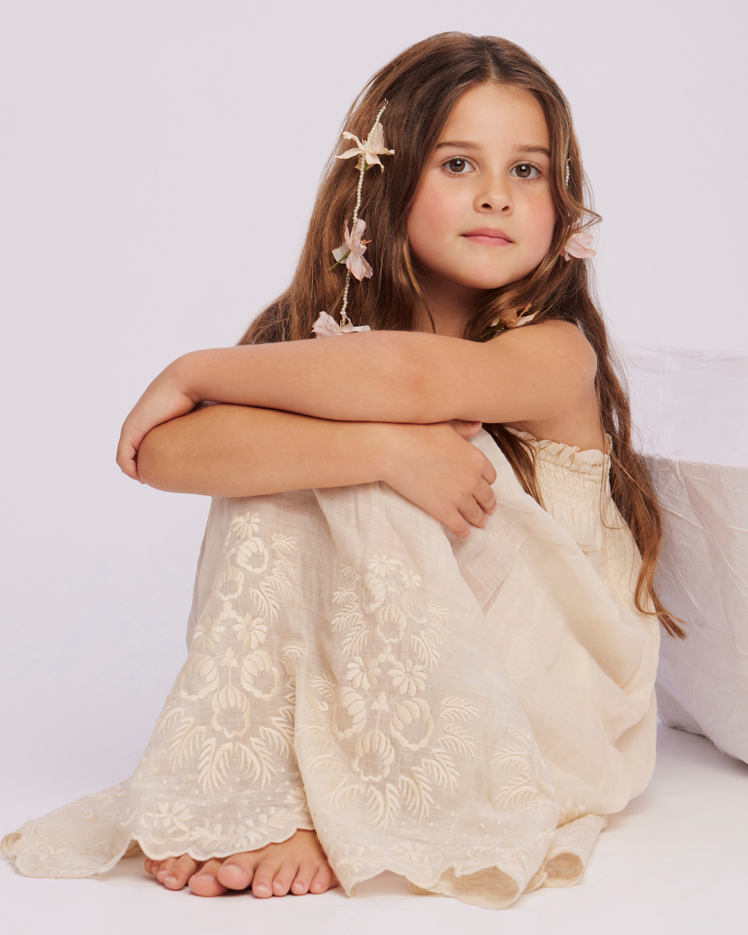 Nomeada como First Crush, esta novidade destaca looks fluidos e românticos, onde as estampas florais autorais são protagonistas e conectam o universo adulto ao infantil, reforçando a identidade artesanal e única da marca. A flor, símbolo do renascimento da primavera, cresce de várias técnicas elaboradas no ateliê da marca como por exemplo em bordado delicado ou em aviamento 3D aplicado em tecido de tule.