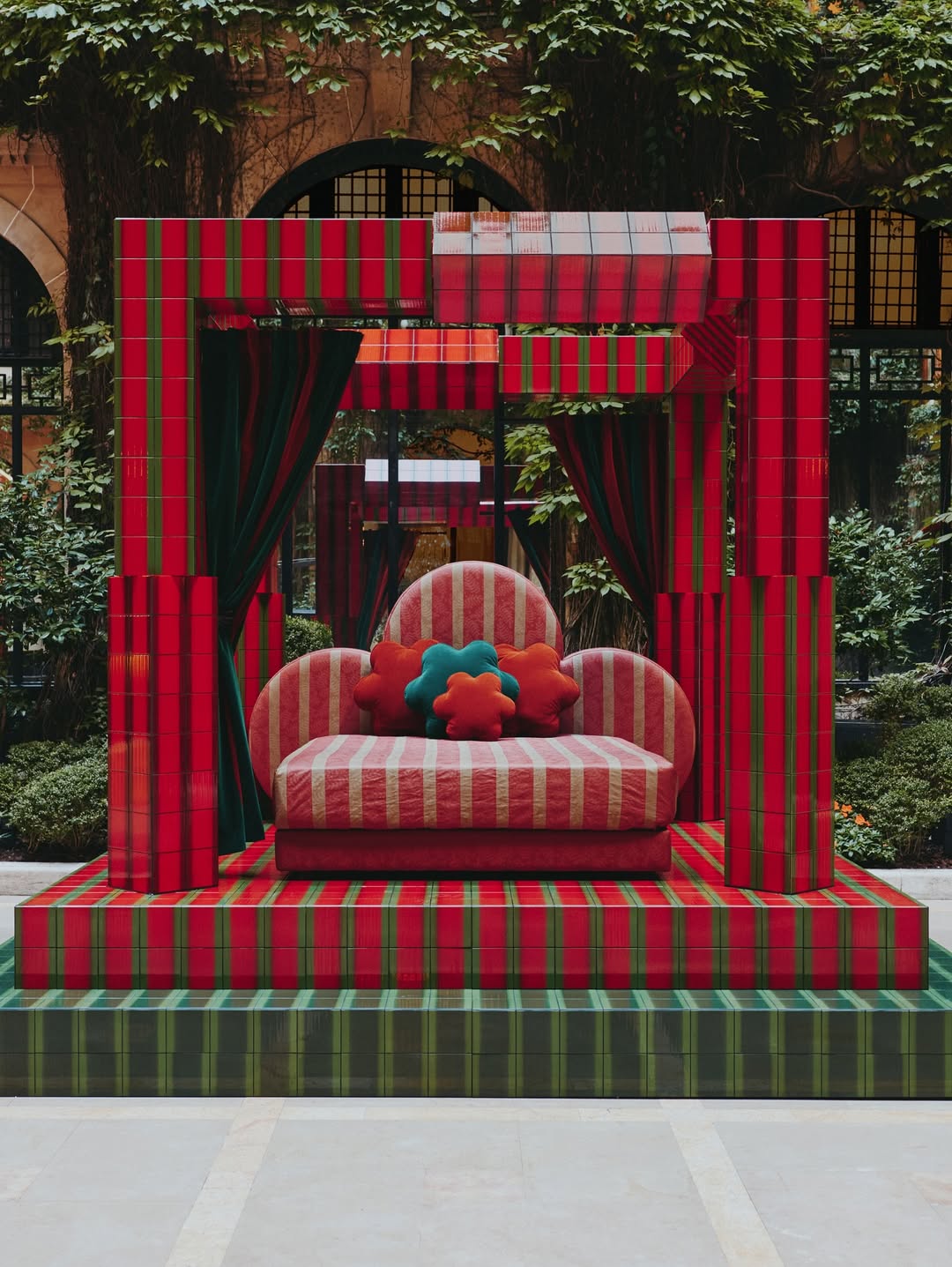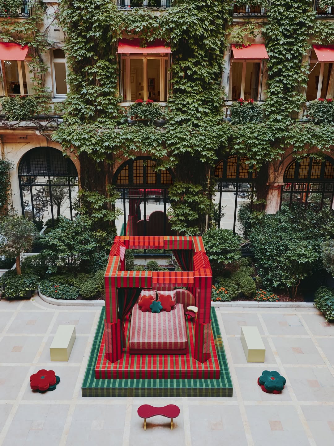 Nomeada como Day Bed, esta nova pop-up tem como objetivo transformar o La Cour Jardin em um lugar de contemplação e encantamento, onde a criatividade contemporânea encontra a arquitetura icônica do local. No centro há uma cama superdimensionada e onírica, que cria uma atmosfera calmante e relaxante por todo o espaço. Uma paleta de cores sutis, combinando verde e vermelho, cria um diálogo visual que presta homenagem ao verde que envolve o pátio e ao característico “vermelho Plaza” do hotel.