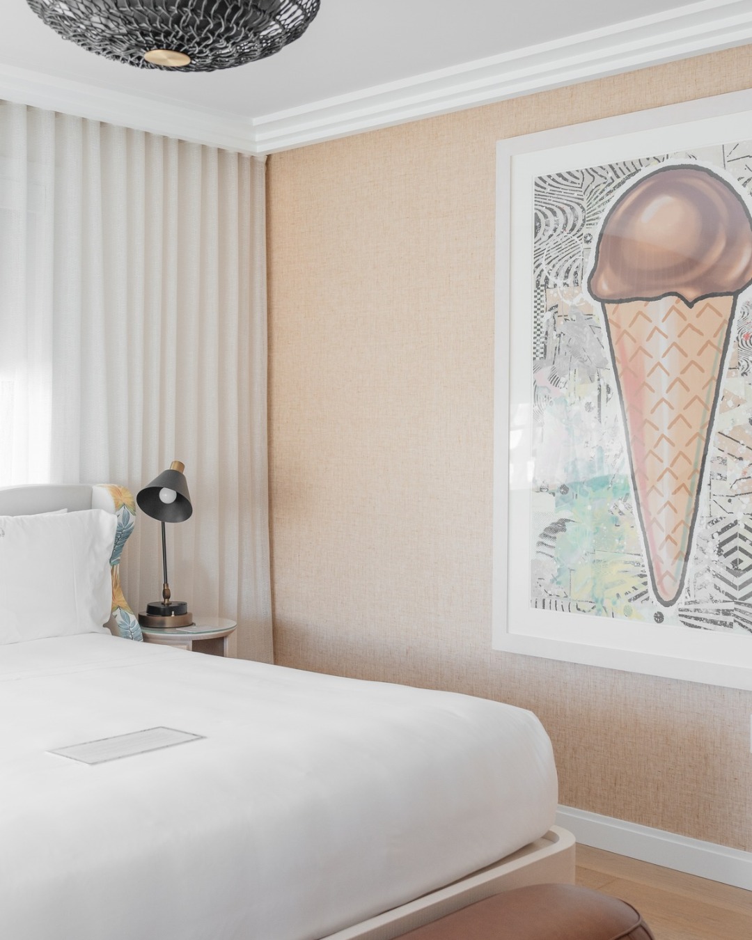 Localizado na Sunset Avenue, o hotel-boutique está instalado em um edifício histórico de 1924, que teve sua estrutura preservada mas foi reformulado para abrigar o empreendimento. O projeto é do escritório Elkus Manfredi Architects, priorizando paleta em tons neutros suaves, tapetes trançados, luminárias de fibras naturais e azulejos refinados.
