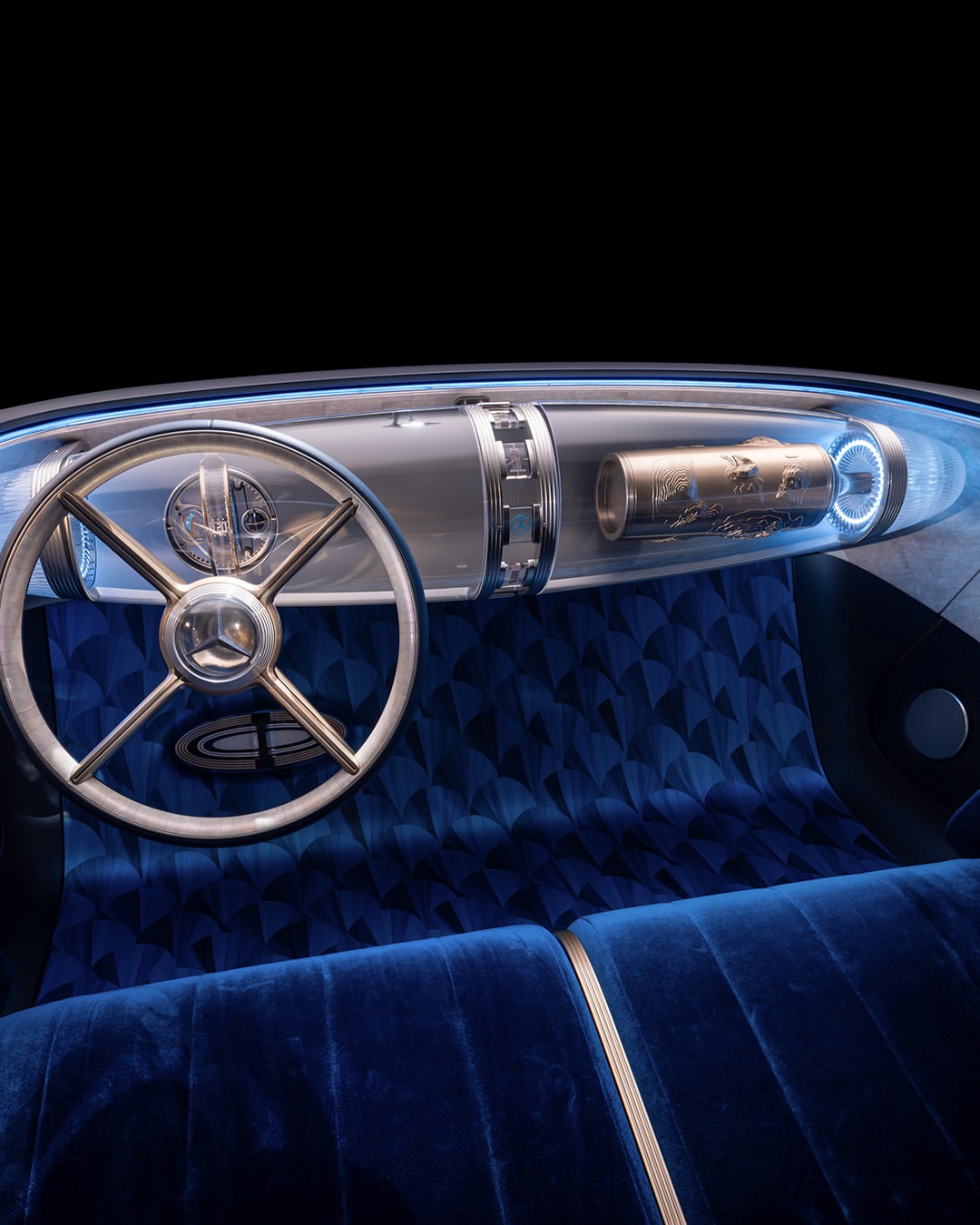 No interior, com seu banco corrido e a elegante traseira, evoca memórias do lendário 300 SL. Sua cabine também inclui um grande volante de quatro raios, uma tela de um pilar a outro, um painel de vidro flutuante, veludo azul e maçanetas de latão polido.