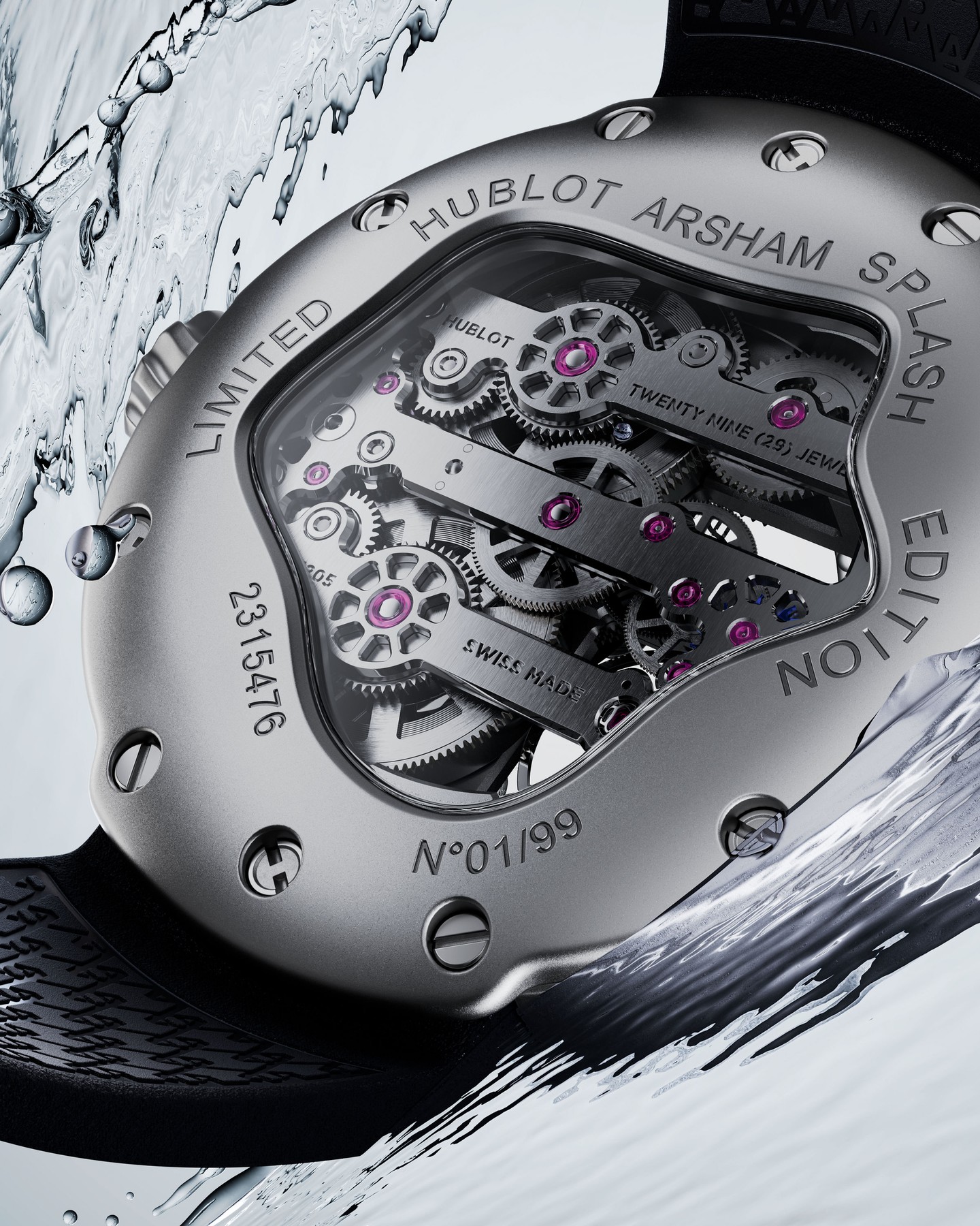 Nomeado como MP-17 Meca-10 Arsham Splash Titanium Sapphire, este novo acessório traz uma caixa de 42 milímetros, misturando titânio com cristal de safira e revelando o coração mecânico pelo recorte em “splash”. Os seis parafusos em H e o fecho em formato H mantêm o DNA da marca. O recorte orgânico em “splash” entrega profundidade e deixa o calibre Meca-10 em evidência.