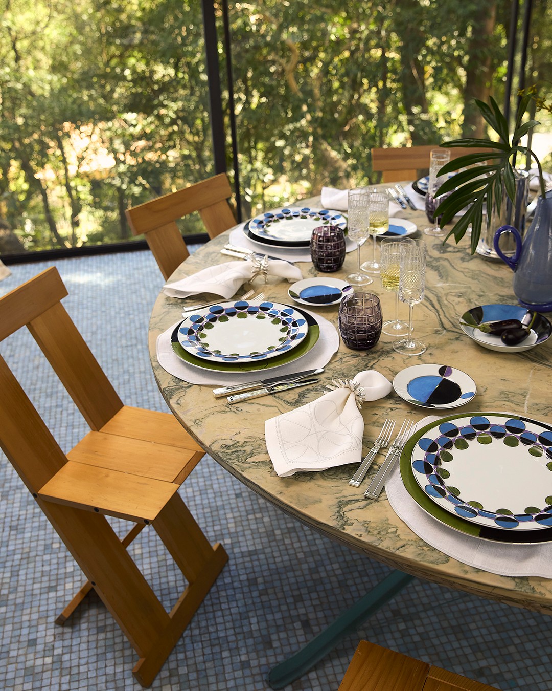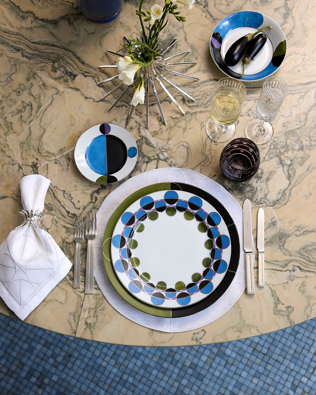 Disponibiliza 14 peças entre louças e acessórios de tableware, destacando decoração geométrica precisa e acabamento em platina. Além das louças de mesa, inclui vasos, vide-poches, têxteis bordados, copos e taças de cristal, compondo uma proposta contemporânea e versátil, marcada por identidade, ritmo e expressão.