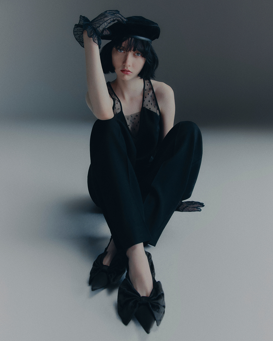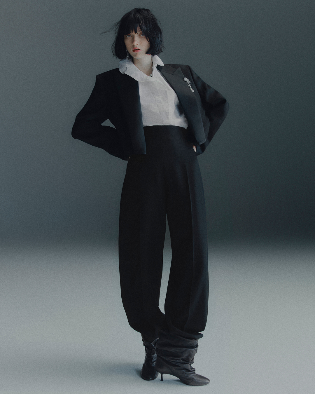 Suas peças-chave têm um ar nostálgico, porém sempre ancorado em toques contemporâneos, como o imponente smoking preto com blazer cropped e calças de cintura alta com aberturas na parte de trás. Em outerwear, o destaque vai para o sobretudo de lã marrom e preto, com padrão xadrez ampliado, cinto e echarpe removível, além da jaqueta cropped em couro preto lavado, inspirada no trench coat.