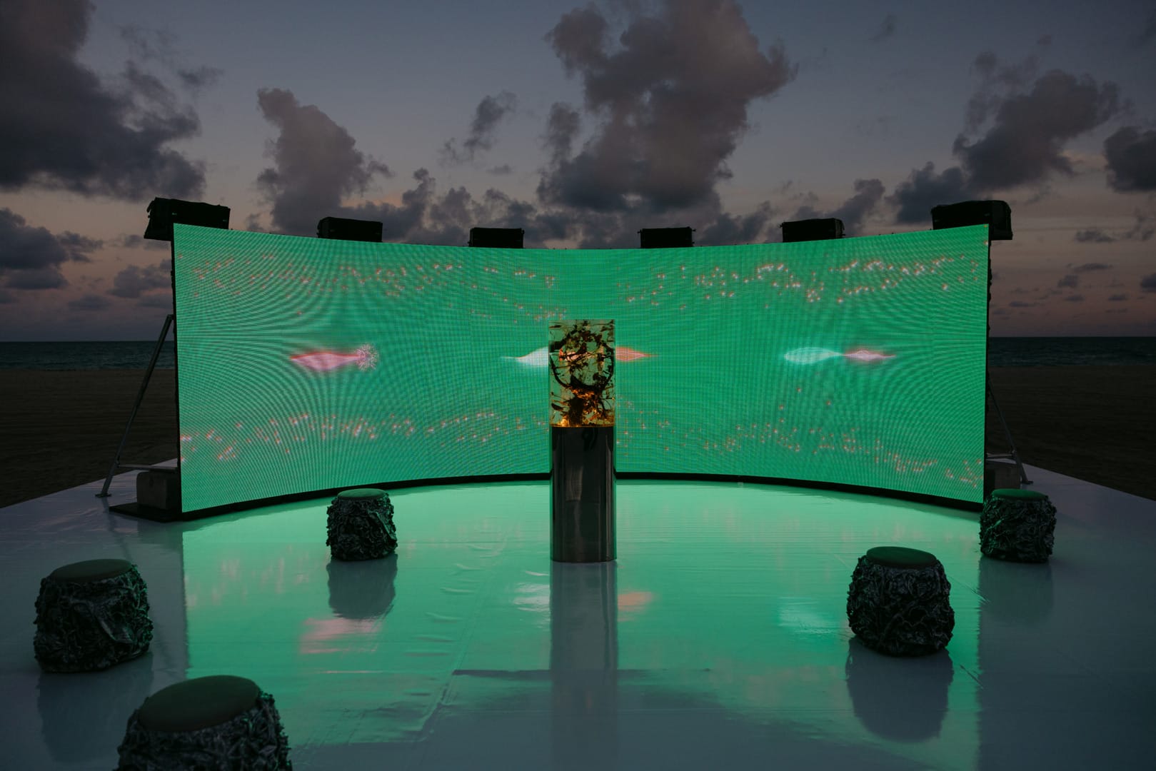 Nomeada como Plant Pulses, esta nova instalação está localizada na Praia do Faena, traduzindo pesquisas recentes sobre a comunicação vegetal, conduzidas pelos cientistas Bartek Chojnacki e Klara Chojnacka na Universidade AGH, de Cracóvia. Guiado por sua prática botânica e por seu diálogo de longa data com a Perrier-Jouët, Rusak transformou dados ultrassônicos emitidos por plantas sob diferentes condições em uma paisagem sonora minimalista.