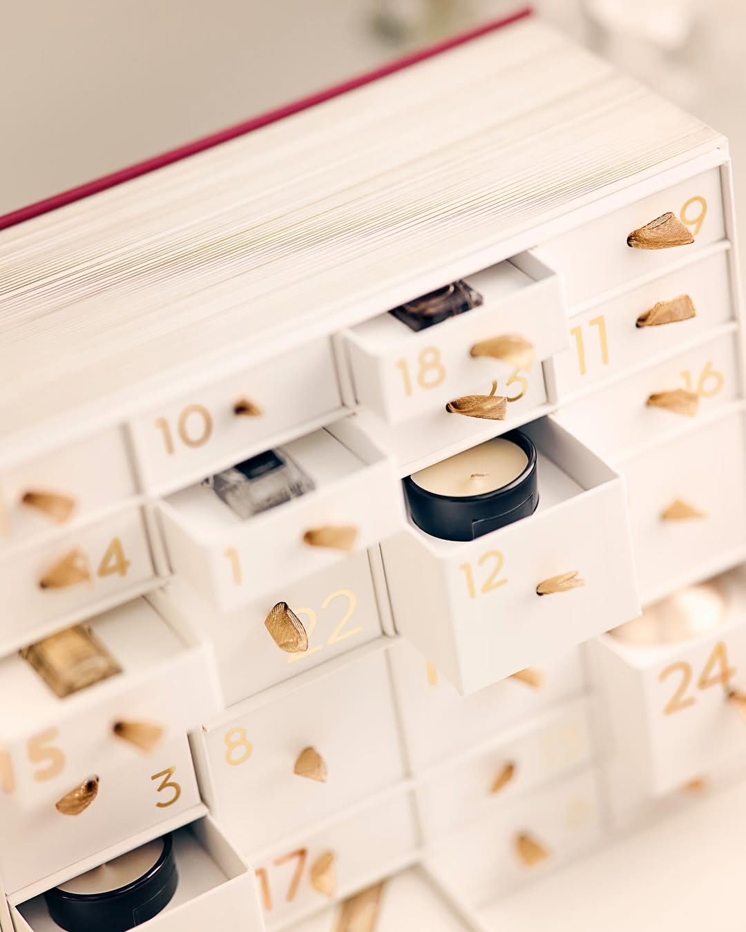Vinte e cinco pequenas portas se abrem para surpreender com uma seleção especial de fragrâncias, maquiagem, velas perfumadas e produtos para a pele da Guerlain. Contando uma história maravilhosamente alegre ao longo de 25 dias com os ícones da casa, o calendário inclui seis miniaturas L’Art & La Matière em 10 ml, duas miniaturas de 7,5 ml de Aqua Allegoria Forte, quatro velas perfumadas de 35 g, dois marcadores de livro e uma miniatura de máscara Noir G. Os mimos de cuidados com a pele do calendário incluem o Creme de Dia de Tratamento com Mel Abeille Royale, de 15 ml, o Concentrado Microlifting Orchidée Impériale, de 5 ml, e uma miniatura do Primer Radiance 24K Parure Gold. É claro que o presente do dia 25 de dezembro é particularmente especial: um Rouge G, no icônico vermelho acetinado 510, acondicionado em um magnífico estojo inspirado na Art Déco.