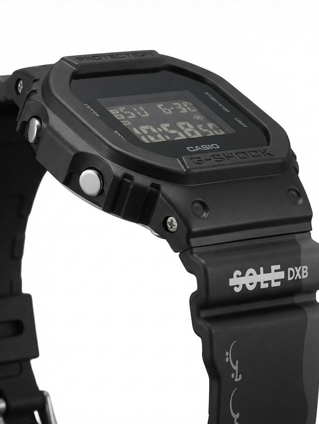 Consiste em um modelo de  relógio quadrado, característica clássica da Casio, mas na pulseira há a marca “Sole DXB”, além de uma escrita em árabe impressa na parte inferior da alça. Seus tons suaves de preto e cinza se mesclam às texturas e ao acabamento geral mais contido.