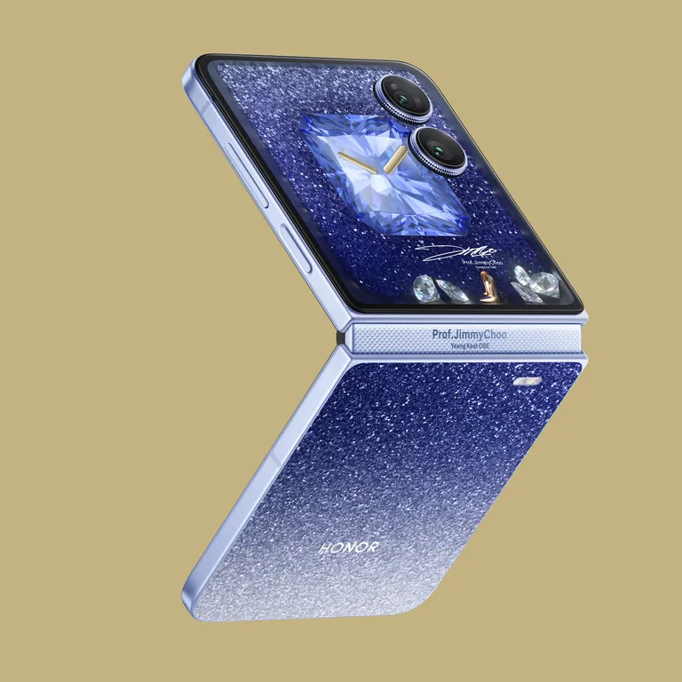 Em edição limitada, o Magic V Flip2 recebeu um toque de brilho pelas mãos de Jimmy Choo. A equipe de design especificou uma tampa traseira reluzente em azul e prata, juntamente com papéis de parede e mostradores de relógio personalizados, além de um título gravado na dobradiça. Este modelo topo de linha vem com 16 GB de memória e 1 TB de armazenamento como padrão.
