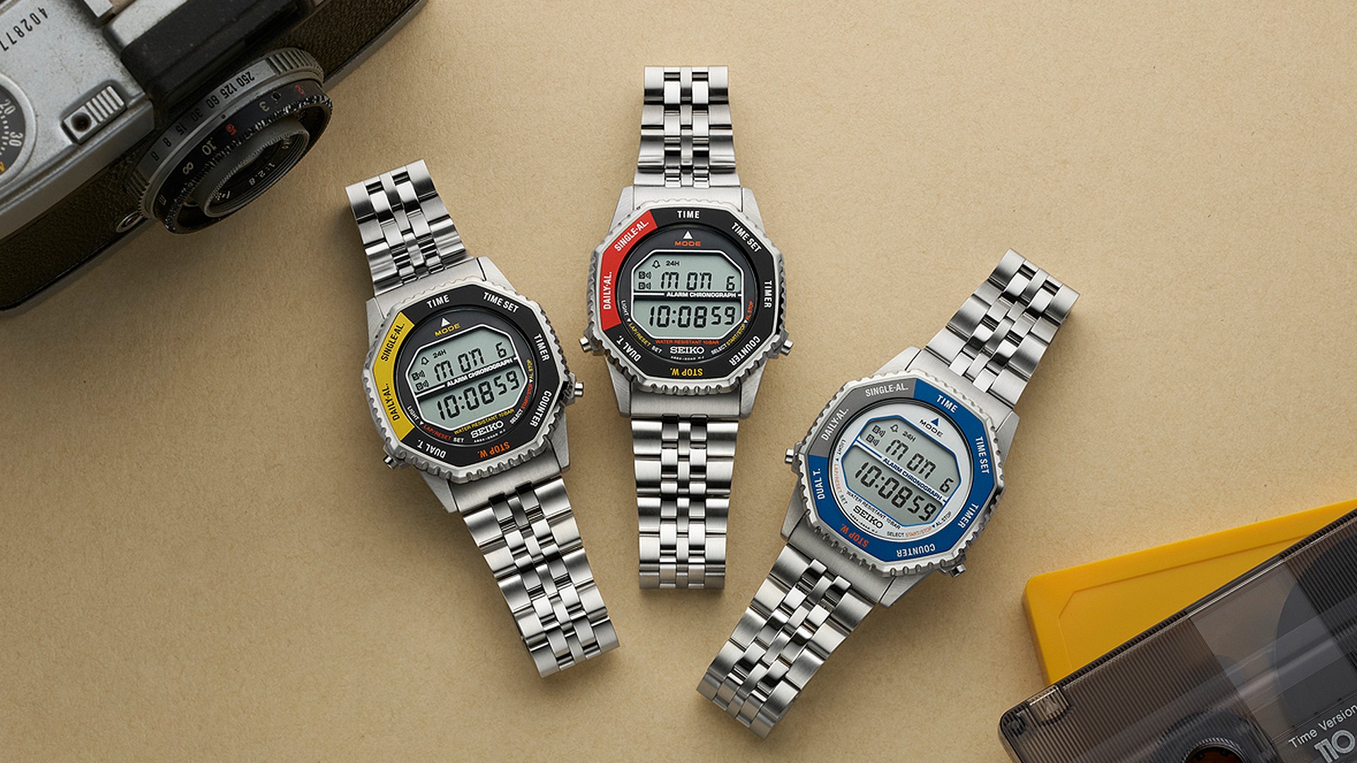 Este modelo mantém o característico mostrador octogonal com aro giratório, elemento que permite alternar entre funções como alarme, cronômetro e timer apenas com um toque — recurso que se tornou símbolo de praticidade e vanguarda nos anos 1980. Nesta reedição, a Seiko manteve as proporções próximas ao original, com 37mm de diâmetro e 10,6 mm de espessura, em caixa de aço inoxidável com cristal Hardlex.